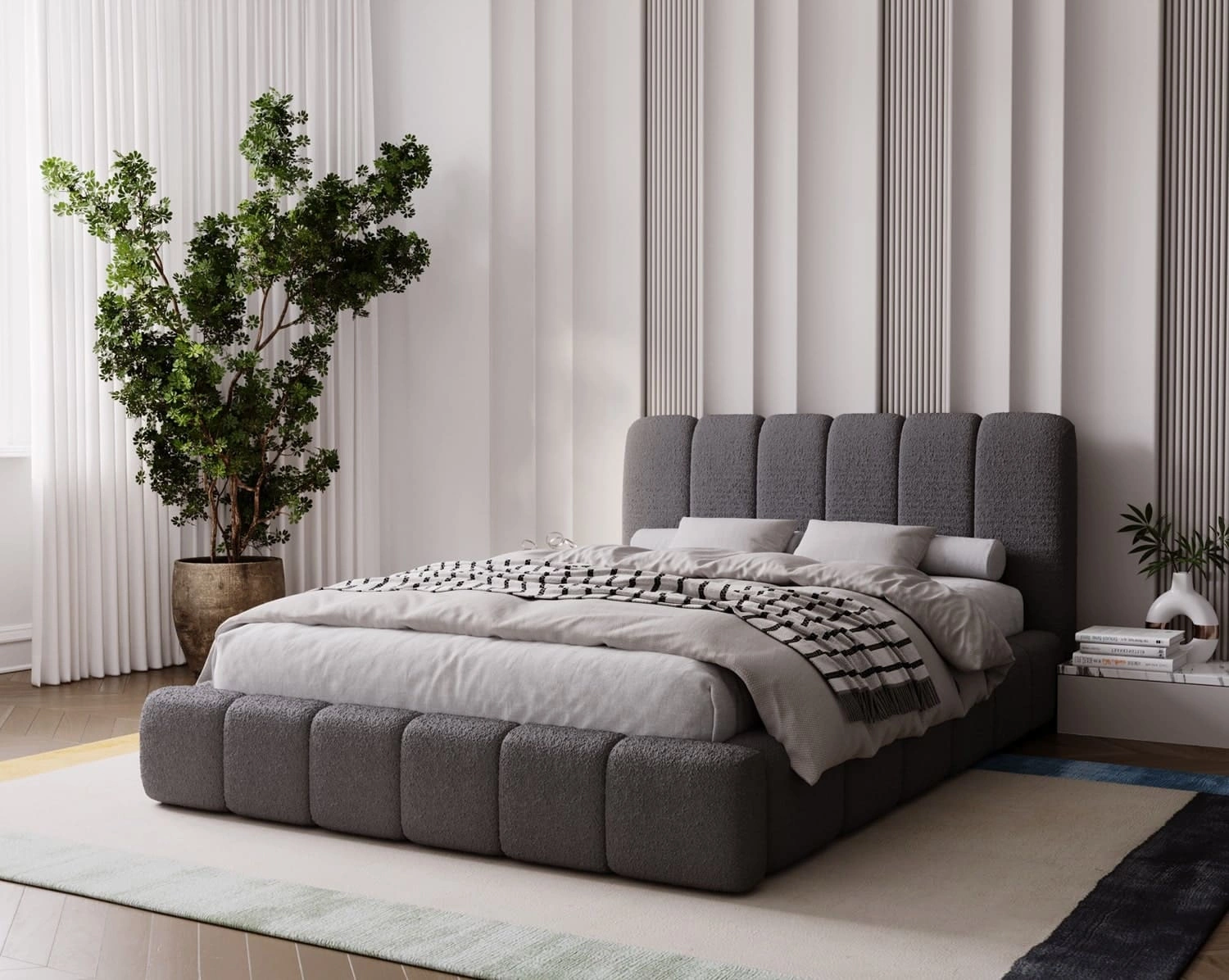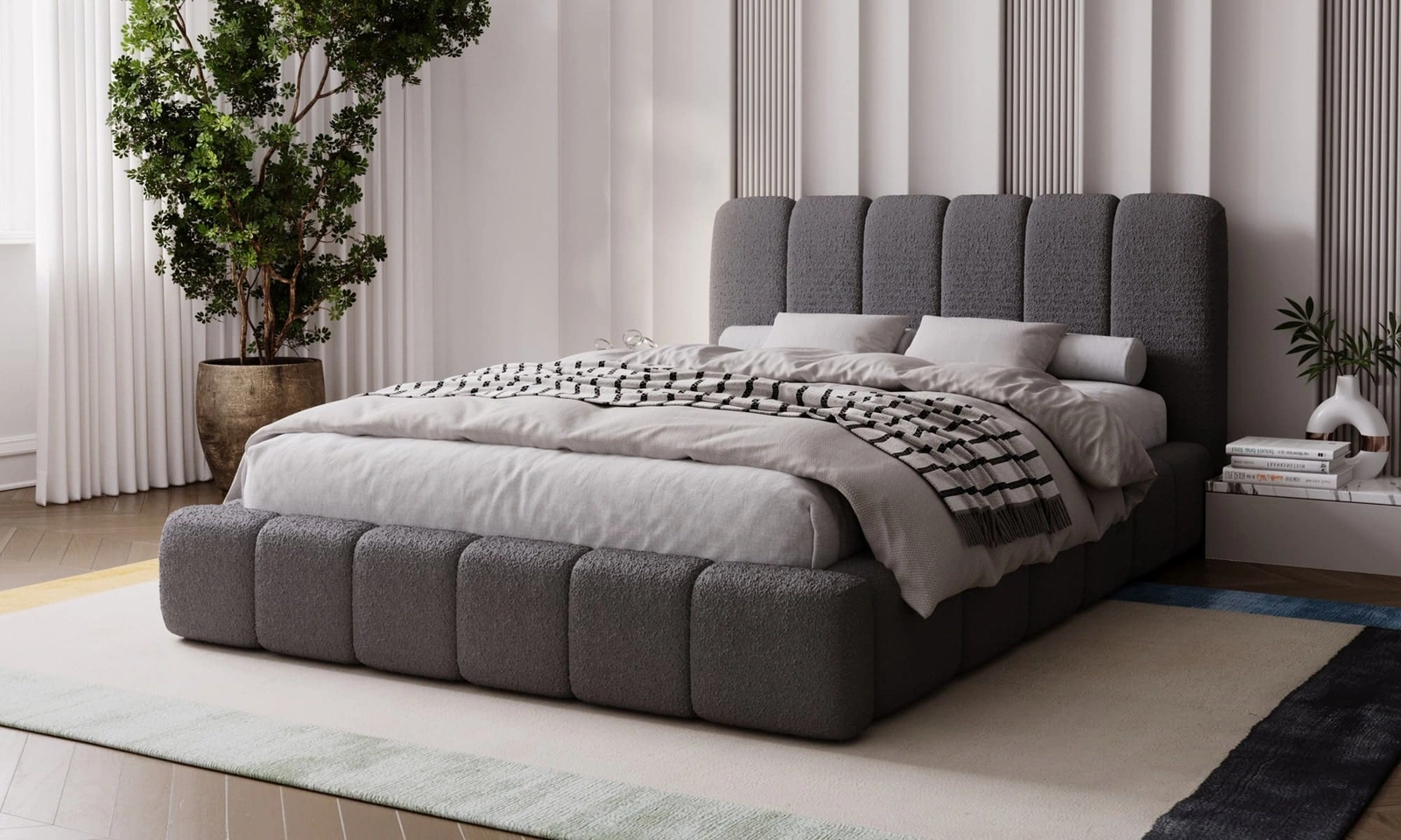 Łóżko wykonane z miękkiej i miłej w dotyku tkaniny o strukturalnej powierzchni Anthology 18 gwarantuje najwyższy komfort i funkcjonalność podczas codziennego wypoczynku w sypialni. Tkanina posiada powłokę hydrofobową, co gwarantuje ograniczone wchłanianie cieczy. Tkanina jest również trudnopalna, a także jest łatwa do utrzymania w czystości. Dodatkowym atutem tkaniny Anthology jest pętelkowa powierzchnia, która nadaje łóżku wyjątkowej urody. Charakterystyczną cechą tej tkaniny są liczne pętelki oraz supełki na powierzchni tkaniny, które posiadają nieregularny kształt oraz wielkość. Dzięki wszystkim właściwościom użytej tkaniny, łóżko na długo zachowa swój pierwotny wygląd. Konstrukcja łóżka zapewnia dużą stabilność i wygodę użytkowania. Rama łóżka jest wykonana z drewna oraz płyty meblowej. Przeszycia na wezgłowiu i ramie łóżka przyciągą wzrok i nadają łóżku szczególnego charakteru.