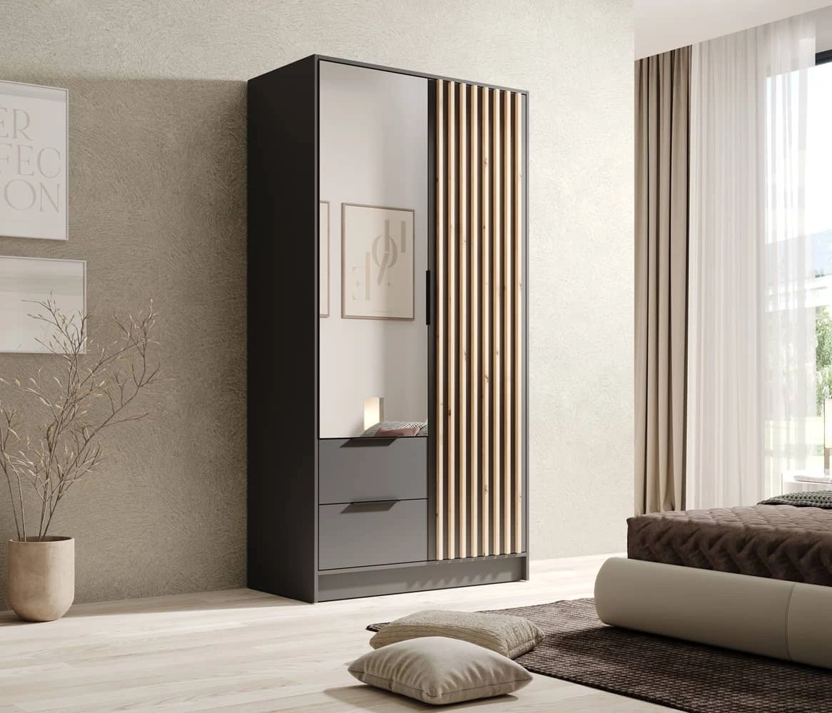 Szafa Neri dzieli się na część z drążkiem na ubrania wiszące i część z półkami. Szafa została wyposażona również w dwie szuflady, dodatkowo powiększając przestrzeń do przechowywania. Szafy do sypialni z kolekcji Neri wykonane są z wysokiej jakości płyty laminowanej o grubości 16mm, która charakteryzuje się odpornością na wpływ czynników zewnętrznych takich jak obicia, uderzenia i niefortunne zadrapania. Stylowym wykończeniem drzwi szafy są czarne uchwyty krawędziowe, które poza swoją podstawową funkcją, nadają niezwykle gustownego wyglądu. Duże lustro rozjaśni i optycznie powiększy przestrzeń.