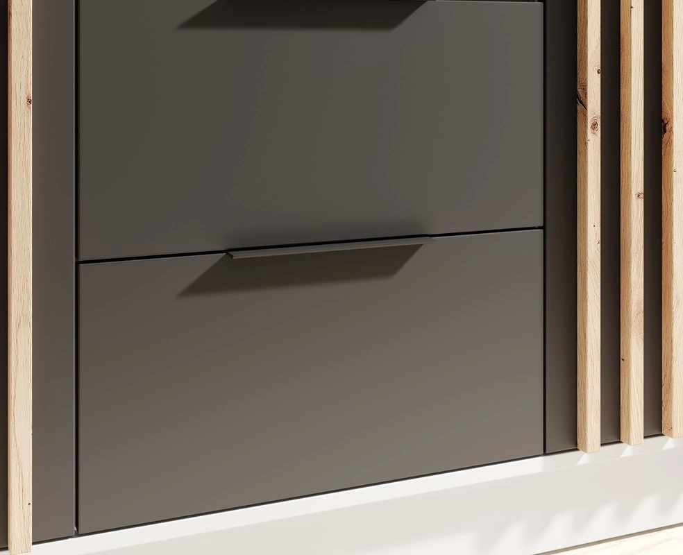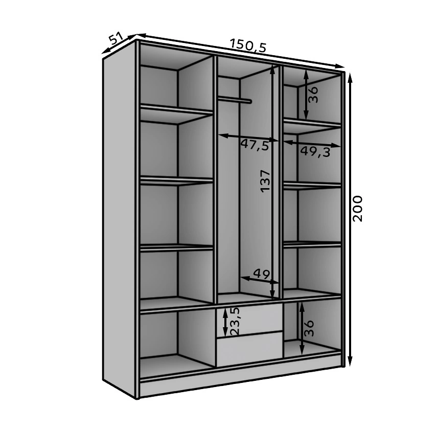 Szafa Neri dzieli się na część z drążkiem na ubrania wiszące i część z półkami. Szafa została wyposażona również w dwie szuflady, dodatkowo powiększając przestrzeń do przechowywania. Szafy do sypialni z kolekcji Neri wykonane są z wysokiej jakości płyty laminowanej o grubości 16mm, która charakteryzuje się odpornością na wpływ czynników zewnętrznych takich jak obicia, uderzenia i niefortunne zadrapania. Stylowym wykończeniem drzwi szafy są czarne uchwyty krawędziowe, które poza swoją podstawową funkcją, nadają niezwykle gustownego wyglądu. Duże lustro rozjaśni i optycznie powiększy przestrzeń.