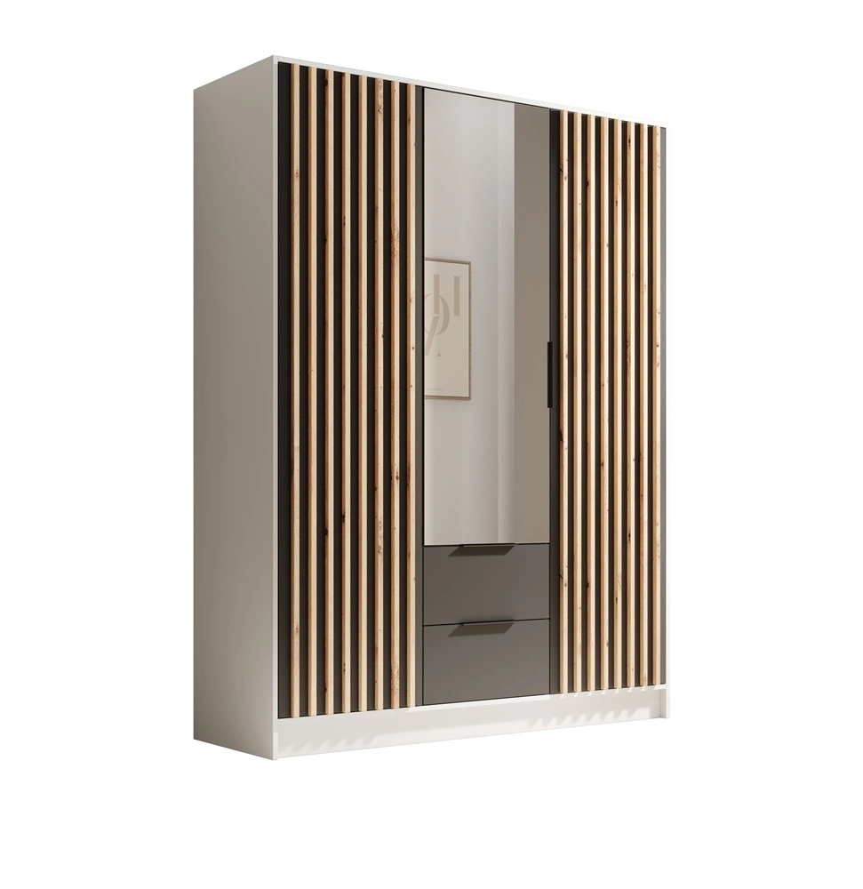 Szafa z lustrem jest skonstruowana z 3 drzwi oraz 2 szuflad. Szafa gwarantuje komfortowe i bezproblemowe korzystanie oraz trwałość całego mebla przez wiele lat użytkowania. Standardowym wyposażeniem są prowadnice szuflad z systemem cichego domykania. Stylowy design sprawia, że szafa na ubrania z powodzeniem sprawdzi się jako szafa z lustrem do sypialni, jako szafa do przedpokoju lub szafa do pokoju dziecięcego. Szafa z lustrem Neri będzie również świetnym wyborem do pokoju niemowlęcego. Doskonale sprawdzi się także w roli garderoby do przedpokoju.