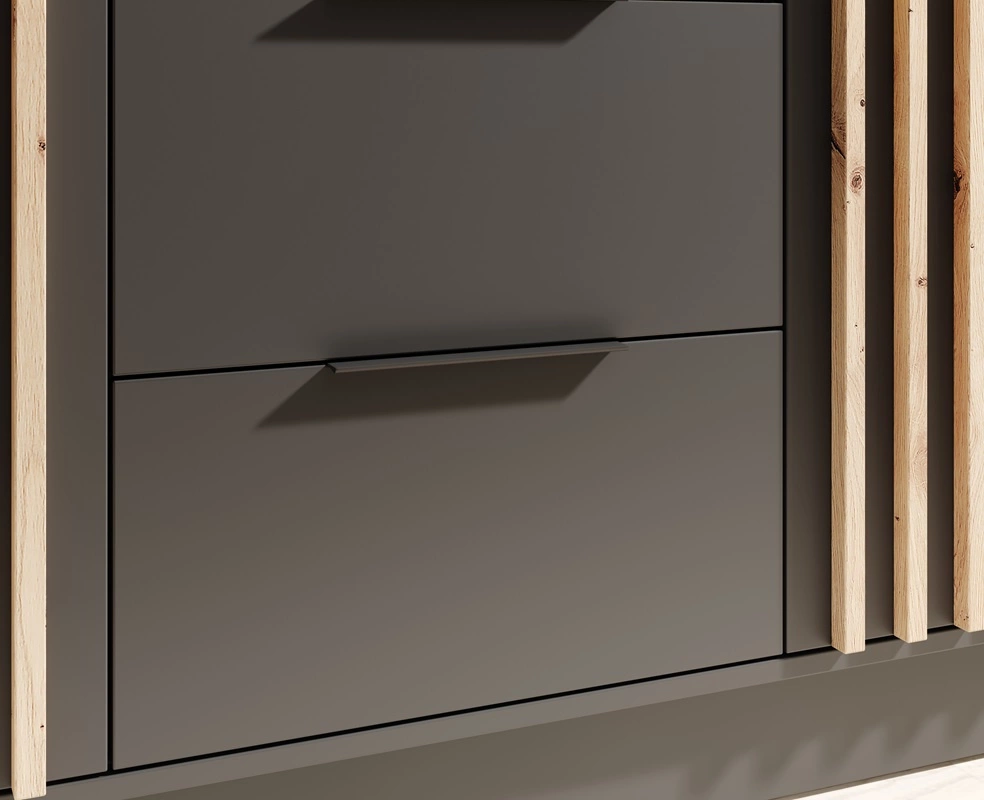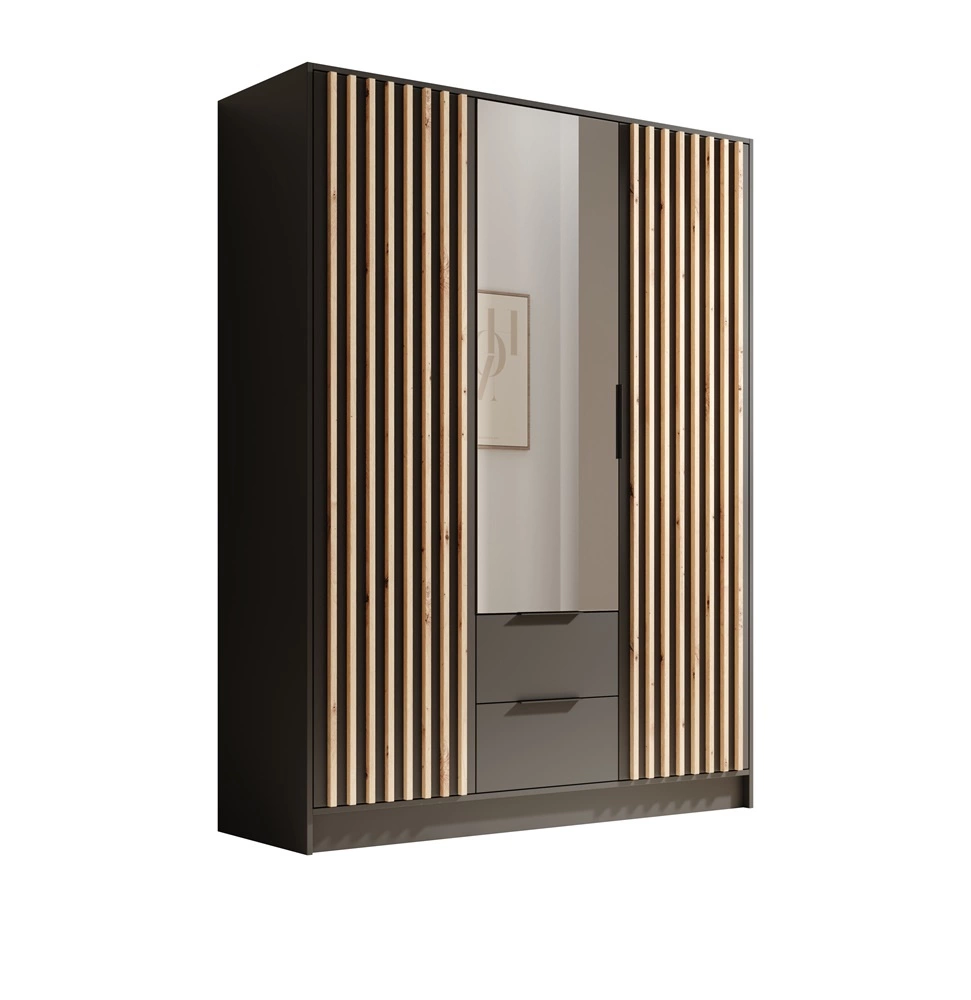 Szafa Neri dzieli się na część z drążkiem na ubrania wiszące i część z półkami. Szafa została wyposażona również w dwie szuflady, dodatkowo powiększając przestrzeń do przechowywania. Szafy do sypialni z kolekcji Neri wykonane są z wysokiej jakości płyty laminowanej o grubości 16mm, która charakteryzuje się odpornością na wpływ czynników zewnętrznych takich jak obicia, uderzenia i niefortunne zadrapania. Stylowym wykończeniem drzwi szafy są czarne uchwyty krawędziowe, które poza swoją podstawową funkcją, nadają niezwykle gustownego wyglądu. Duże lustro rozjaśni i optycznie powiększy przestrzeń.