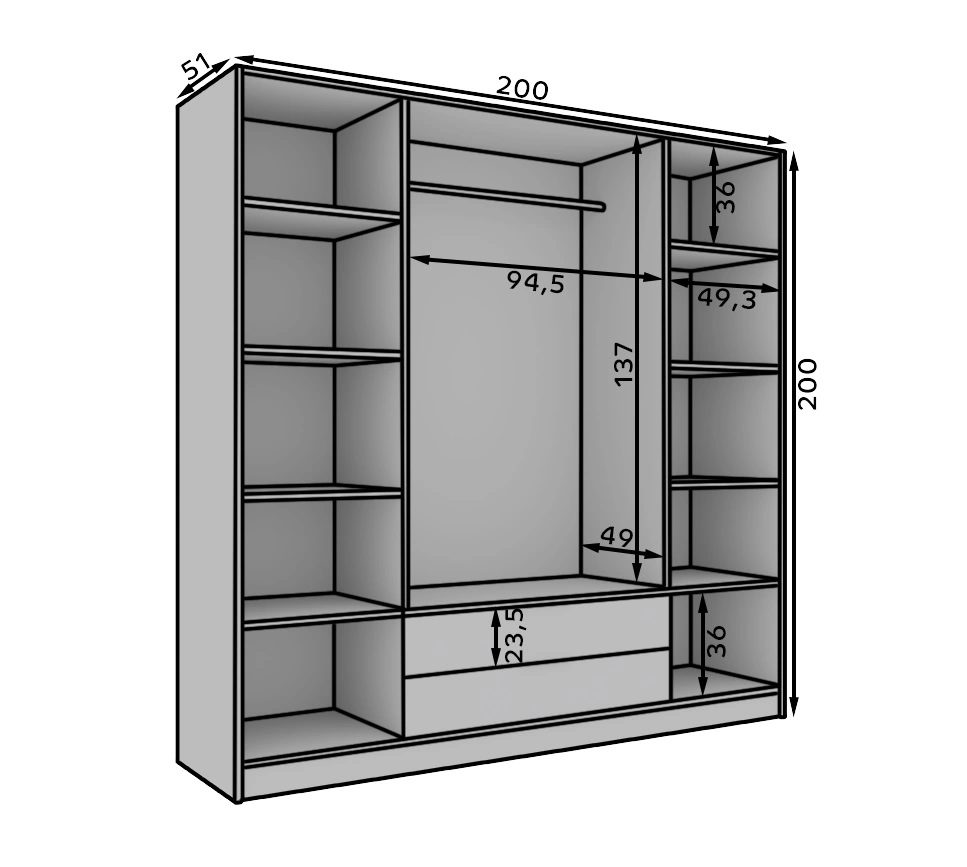 Szafa Neri dzieli się na część z drążkiem na ubrania wiszące i część z półkami. Szafa została wyposażona również w dwie szuflady, dodatkowo powiększając przestrzeń do przechowywania. Szafy do sypialni z kolekcji Neri wykonane są z wysokiej jakości płyty laminowanej o grubości 16mm, która charakteryzuje się odpornością na wpływ czynników zewnętrznych takich jak obicia, uderzenia i niefortunne zadrapania. Stylowym wykończeniem drzwi szafy są czarne uchwyty krawędziowe, które poza swoją podstawową funkcją, nadają niezwykle gustownego wyglądu. Duże lustro rozjaśni i optycznie powiększy przestrzeń.
