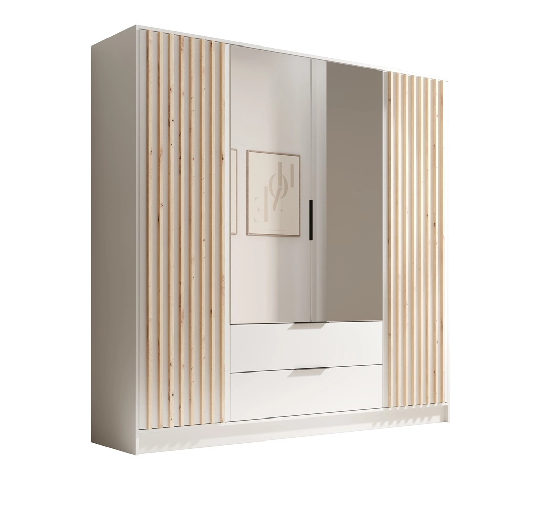Szafa z lustrem jest skonstruowana z 4 drzwi oraz 2 szuflad. Szafa gwarantuje komfortowe i bezproblemowe korzystanie oraz trwałość całego mebla przez wiele lat użytkowania. Standardowym wyposażeniem są prowadnice szuflad z systemem cichego domykania. Stylowy design sprawia, że szafa na ubrania z powodzeniem sprawdzi się jako szafa z lustrem do sypialni, jako szafa do przedpokoju lub szafa do pokoju dziecięcego. Szafa z lustrem Neri będzie również świetnym wyborem do pokoju niemowlęcego. Doskonale sprawdzi się także w roli garderoby do przedpokoju.