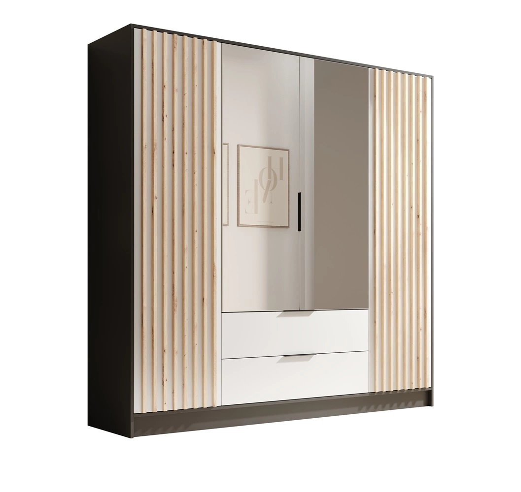 Szafa Neri dzieli się na część z drążkiem na ubrania wiszące i część z półkami. Szafa została wyposażona również w dwie szuflady, dodatkowo powiększając przestrzeń do przechowywania. Szafy do sypialni z kolekcji Neri wykonane są z wysokiej jakości płyty laminowanej o grubości 16mm, która charakteryzuje się odpornością na wpływ czynników zewnętrznych takich jak obicia, uderzenia i niefortunne zadrapania. Stylowym wykończeniem drzwi szafy są czarne uchwyty krawędziowe, które poza swoją podstawową funkcją, nadają niezwykle gustownego wyglądu. Duże lustro rozjaśni i optycznie powiększy przestrzeń.