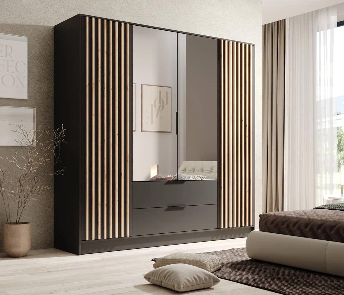 Szafa z lustrem Neri 200 cm czarna stylowe lamele zdobiące drzwi szafy pojemne szuflady uchwyty krawędziowe