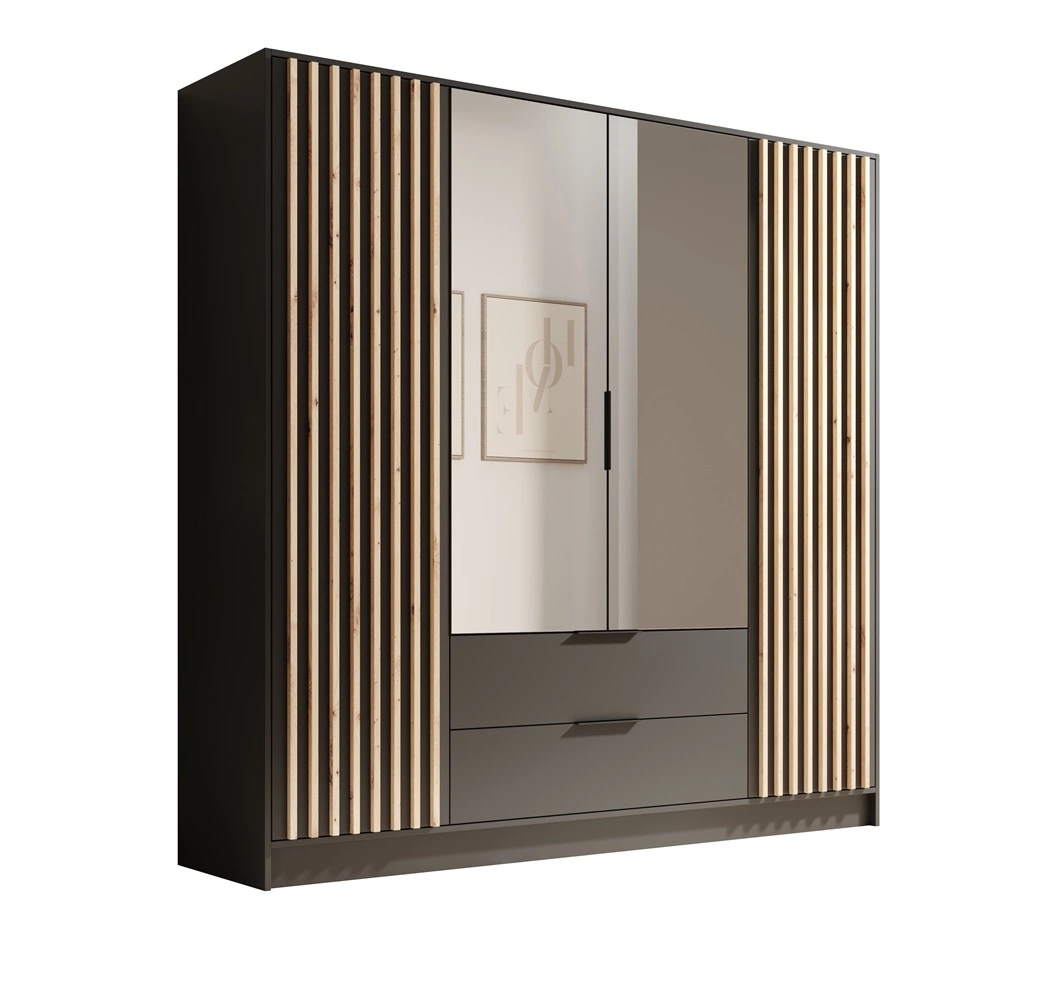 Szafa Neri dzieli się na część z drążkiem na ubrania wiszące i część z półkami. Szafa została wyposażona również w dwie szuflady, dodatkowo powiększając przestrzeń do przechowywania. Szafy do sypialni z kolekcji Neri wykonane są z wysokiej jakości płyty laminowanej o grubości 16mm, która charakteryzuje się odpornością na wpływ czynników zewnętrznych takich jak obicia, uderzenia i niefortunne zadrapania. Stylowym wykończeniem drzwi szafy są czarne uchwyty krawędziowe, które poza swoją podstawową funkcją, nadają niezwykle gustownego wyglądu. Duże lustro rozjaśni i optycznie powiększy przestrzeń.