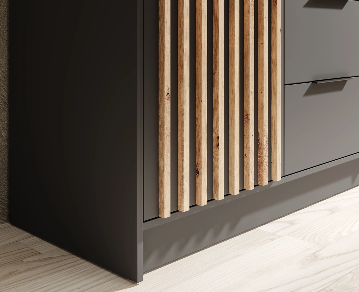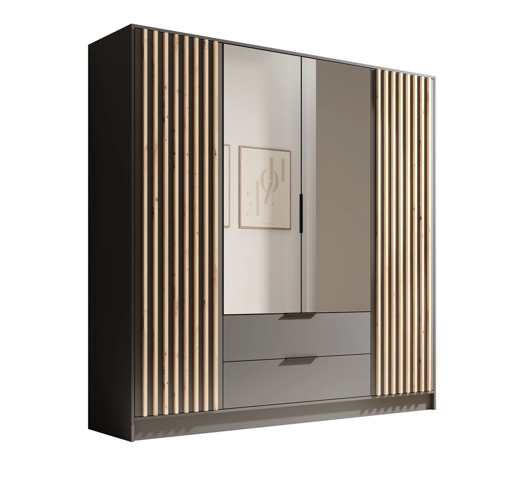 Szafa z lustrem Neri 200 cm grafitowa stylowe lamele zdobiące drzwi szafy pojemne szuflady uchwyty krawędziowe