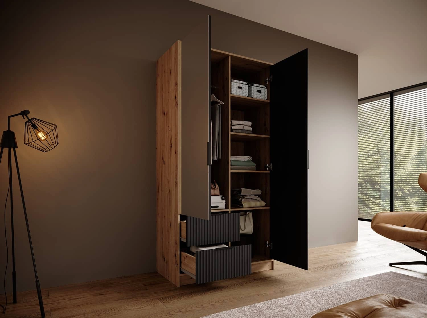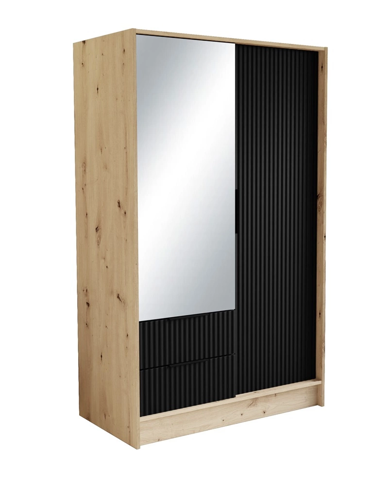 Szafa Norel dzieli się na część z drążkiem na ubrania wiszące i część z półkami. Szafa została wyposażona również w dwie szuflady, dodatkowo powiększając przestrzeń do przechowywania. Ryflowane fronty zostały wykonane z płyty MDF o grubości 18mm. Korpus wykonany z wysokiej jakości płyty laminowanej o grubości 16mm, która charakteryzuje się odpornością na wpływ czynników zewnętrznych takich jak obicia, uderzenia i niefortunne zadrapania. Stylowym wykończeniem drzwi szafy są czarne, metalowe uchwyty krawędziowe, które poza swoją podstawową funkcją, nadają niezwykle gustownego wyglądu. Duże lustro rozjaśni i optycznie powiększy przestrzeń.