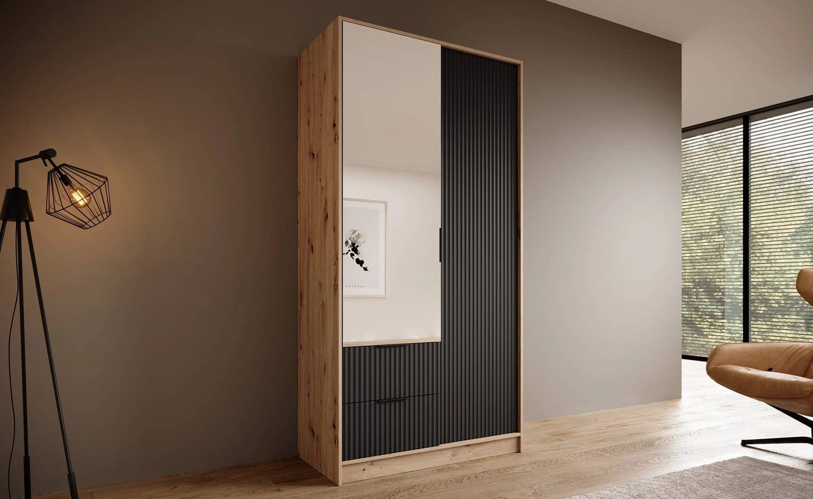 Szafa z lustrem Norel 102 cm dąb artisan / czarny stylowa szafa o nowoczesnym designie z ryflowanymi frontami i pojemnymi szufladami