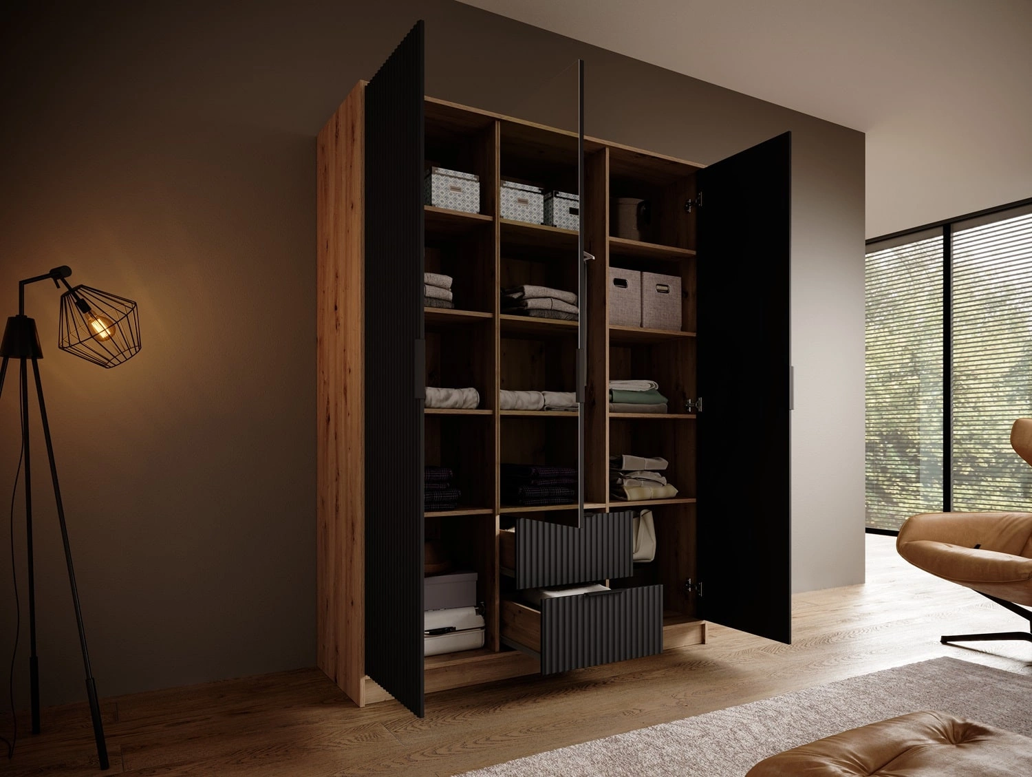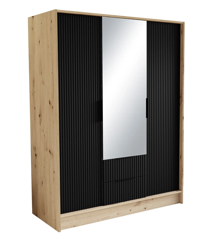 Szafa Norel dzieli się na część z drążkiem na ubrania wiszące i część z półkami. Szafa została wyposażona również w dwie szuflady, dodatkowo powiększając przestrzeń do przechowywania. Ryflowane fronty zostały wykonane z płyty MDF o grubości 18mm. Korpus wykonany z wysokiej jakości płyty laminowanej o grubości 16mm, która charakteryzuje się odpornością na wpływ czynników zewnętrznych takich jak obicia, uderzenia i niefortunne zadrapania. Stylowym wykończeniem drzwi szafy są czarne, metalowe uchwyty krawędziowe, które poza swoją podstawową funkcją, nadają niezwykle gustownego wyglądu. Duże lustro rozjaśni i optycznie powiększy przestrzeń.