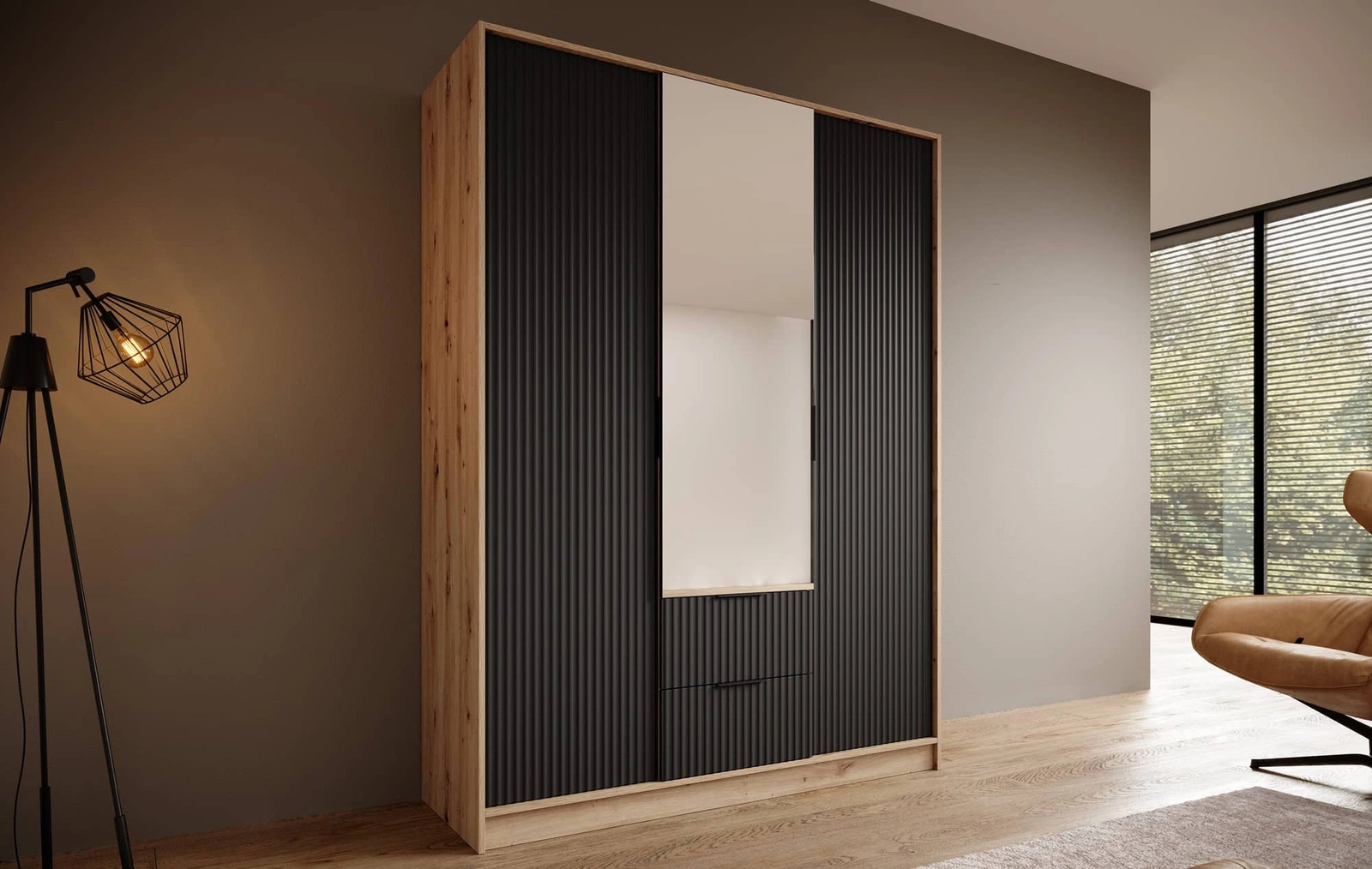 Szafa z lustrem Norel 150 cm dąb artisan / czarny stylowa szafa o nowoczesnym designie z ryflowanymi frontami i pojemnymi szufladami
