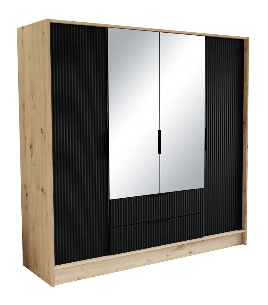 Szafa z lustrem Norel 200 cm dąb artisan / czarny stylowa szafa o nowoczesnym designie z ryflowanymi frontami i pojemnymi szufladami
