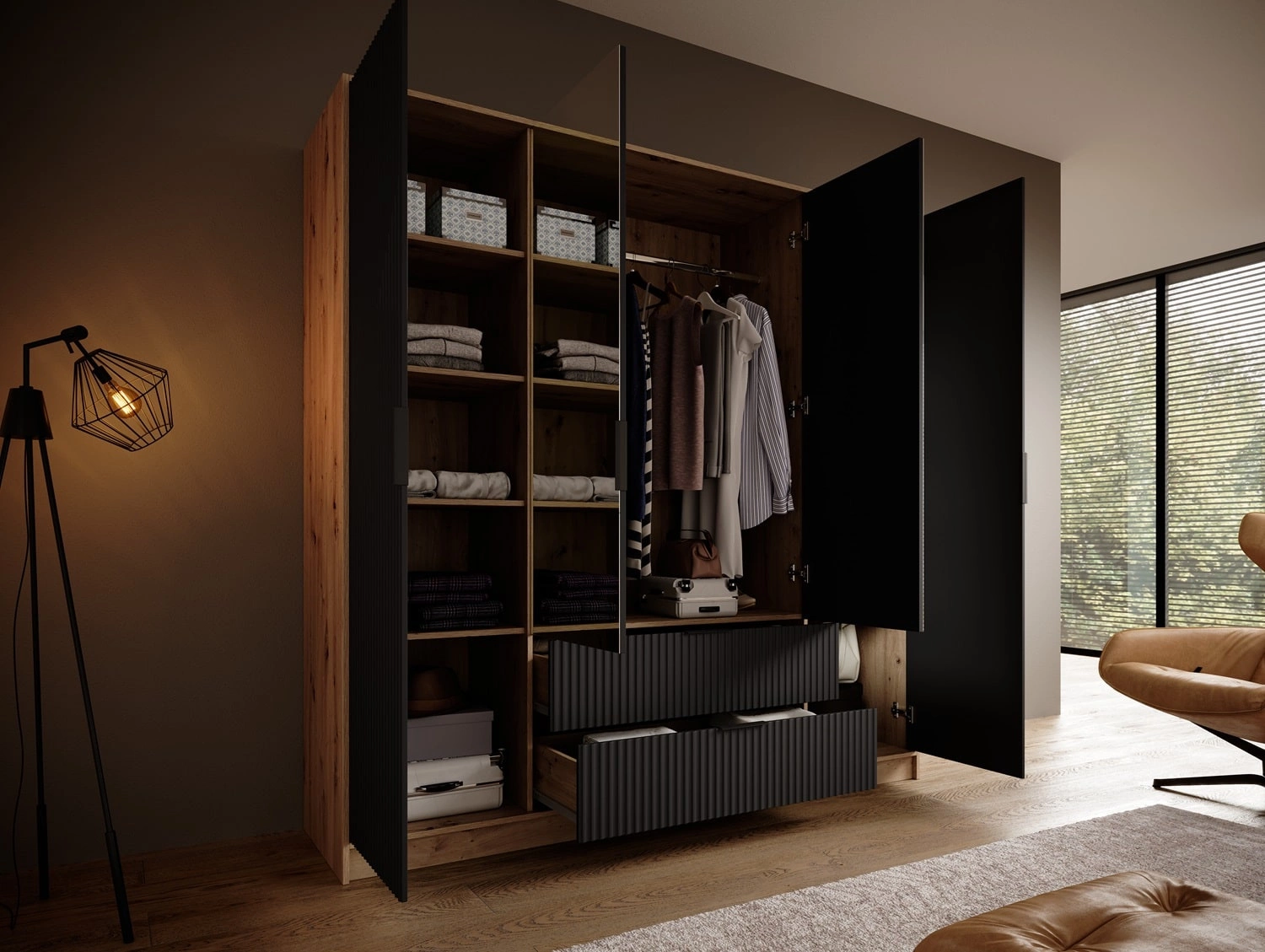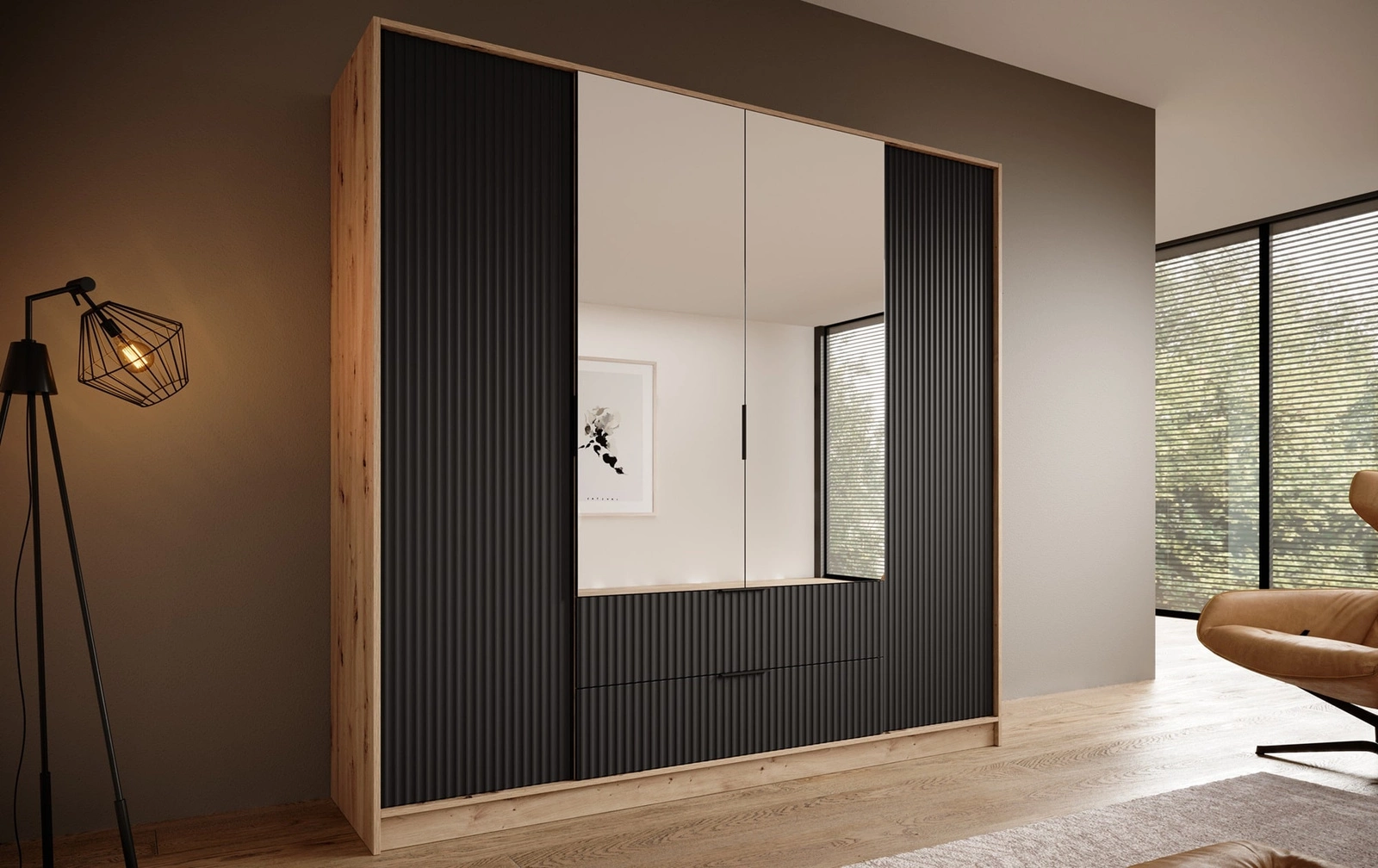 Szafa Norel dzieli się na część z drążkiem na ubrania wiszące i część z półkami. Szafa została wyposażona również w dwie szuflady, dodatkowo powiększając przestrzeń do przechowywania. Ryflowane fronty zostały wykonane z płyty MDF o grubości 18mm. Korpus wykonany z wysokiej jakości płyty laminowanej o grubości 16mm, która charakteryzuje się odpornością na wpływ czynników zewnętrznych takich jak obicia, uderzenia i niefortunne zadrapania. Stylowym wykończeniem drzwi szafy są czarne, metalowe uchwyty krawędziowe, które poza swoją podstawową funkcją, nadają niezwykle gustownego wyglądu. Duże lustro rozjaśni i optycznie powiększy przestrzeń.