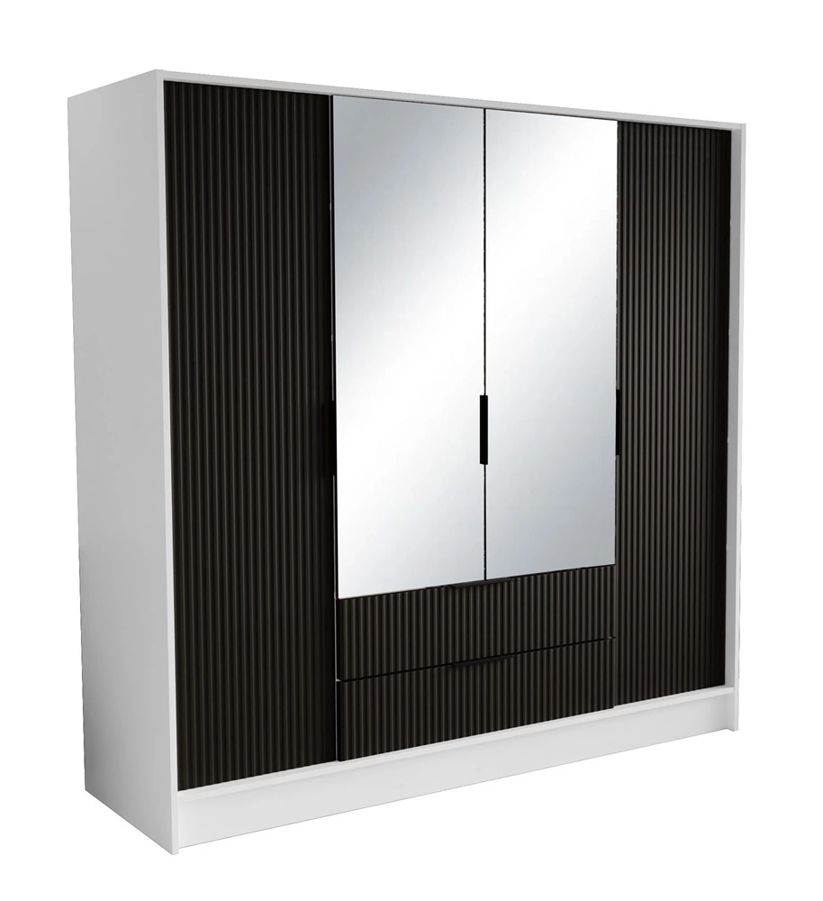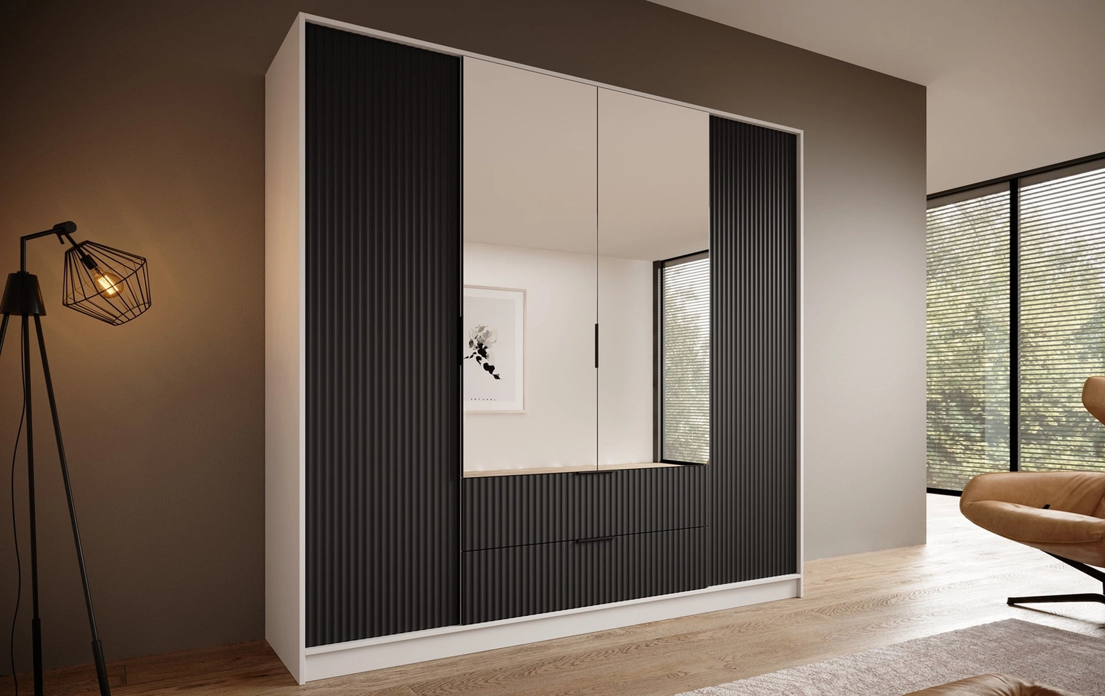 Szafa z lustrem Norel 200 cm biały / czarny stylowa szafa o nowoczesnym designie z ryflowanymi frontami i pojemnymi szufladami