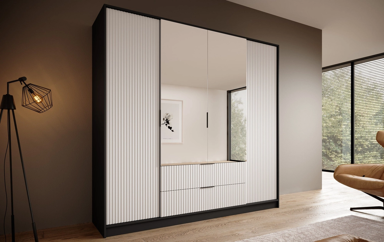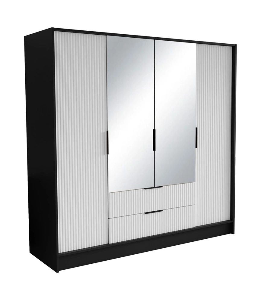 Szafa z lustrem Norel 200 cm czarny / biały stylowa szafa o nowoczesnym designie z ryflowanymi frontami i pojemnymi szufladami
