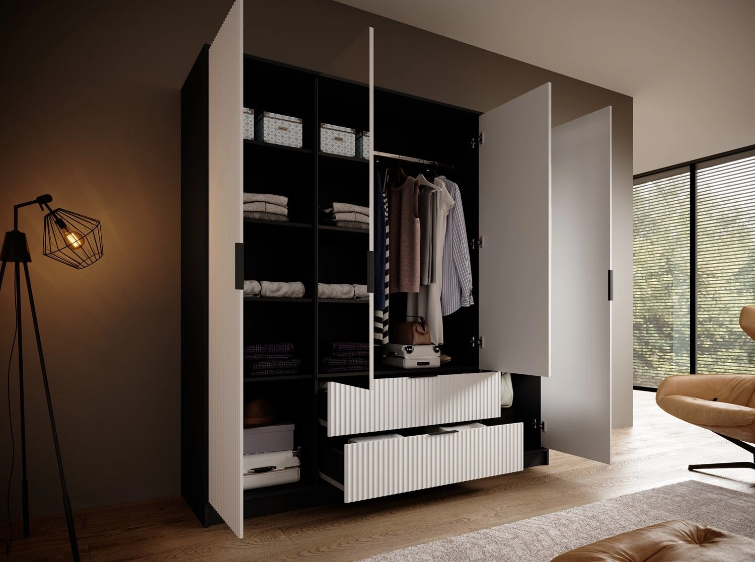 Szafa Norel dzieli się na część z drążkiem na ubrania wiszące i część z półkami. Szafa została wyposażona również w dwie szuflady, dodatkowo powiększając przestrzeń do przechowywania. Ryflowane fronty zostały wykonane z płyty MDF o grubości 18mm. Korpus wykonany z wysokiej jakości płyty laminowanej o grubości 16mm, która charakteryzuje się odpornością na wpływ czynników zewnętrznych takich jak obicia, uderzenia i niefortunne zadrapania. Stylowym wykończeniem drzwi szafy są czarne, metalowe uchwyty krawędziowe, które poza swoją podstawową funkcją, nadają niezwykle gustownego wyglądu. Duże lustro rozjaśni i optycznie powiększy przestrzeń.