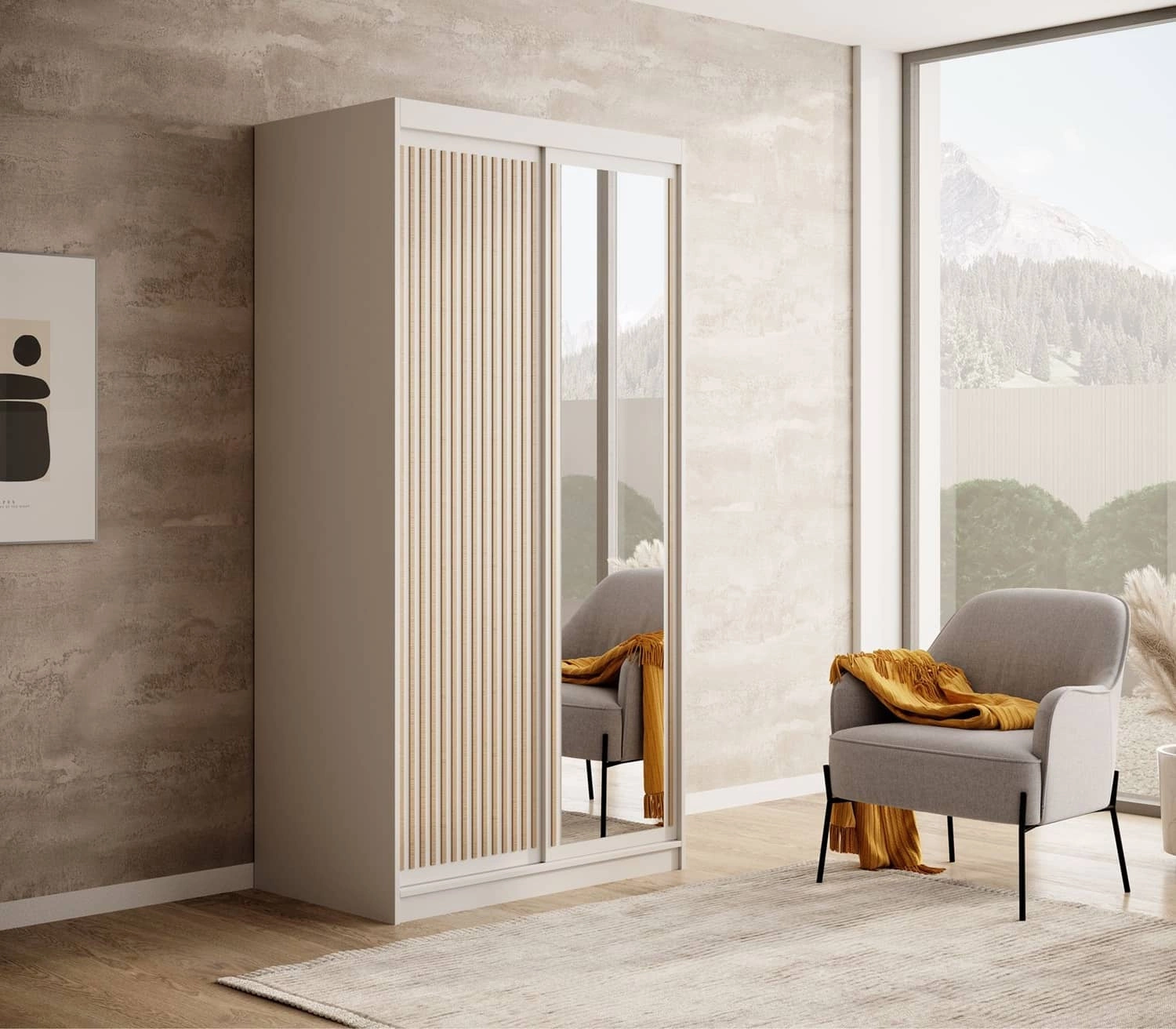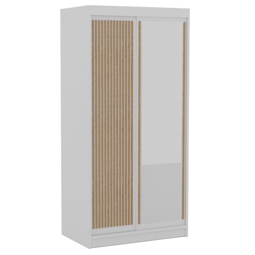 Szafa przesuwna z lustrem Delia 100 cm biała stylowa szafa z ozdobnymi lamelami w kolorze drewna wpasuje się do każdej aranżacji