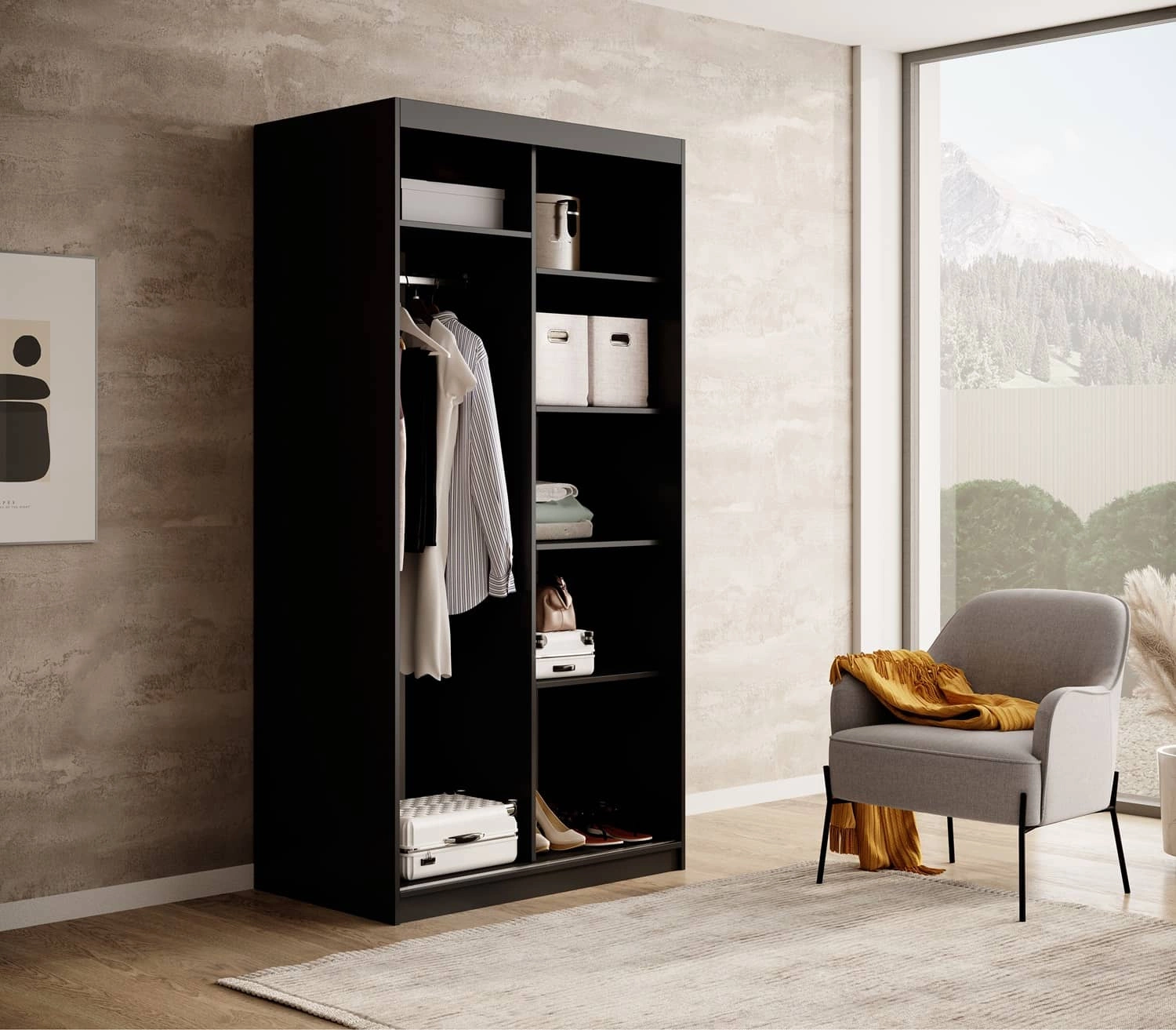 Szafa przesuwna z lustrem Delia 100 cm w kolorze czarnym to nowoczesny mebel, który zaskakuje unikatowym stylem.