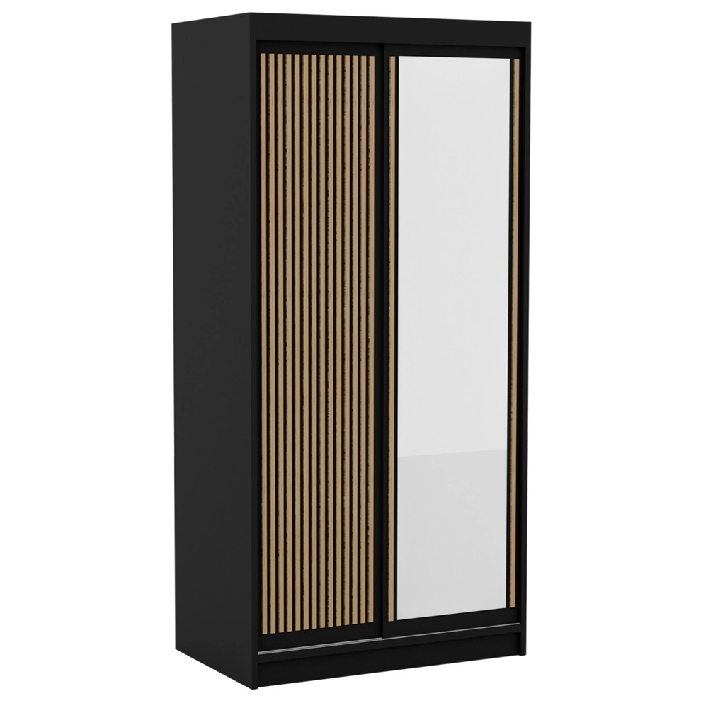 Szafa przesuwna z lustrem Delia 100 cm czarna stylowa szafa z ozdobnymi lamelami w kolorze drewna wpasuje się do każdej aranżacji