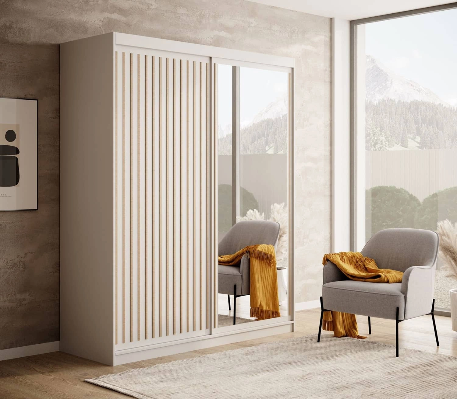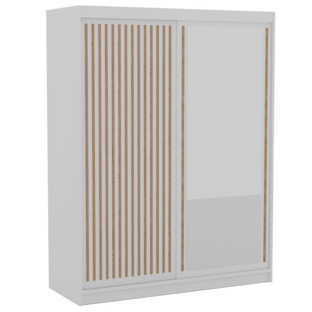 Szafa przesuwna z lustrem Delia 160 cm biała stylowa szafa z ozdobnymi lamelami w kolorze drewna wpasuje się do każdej aranżacji