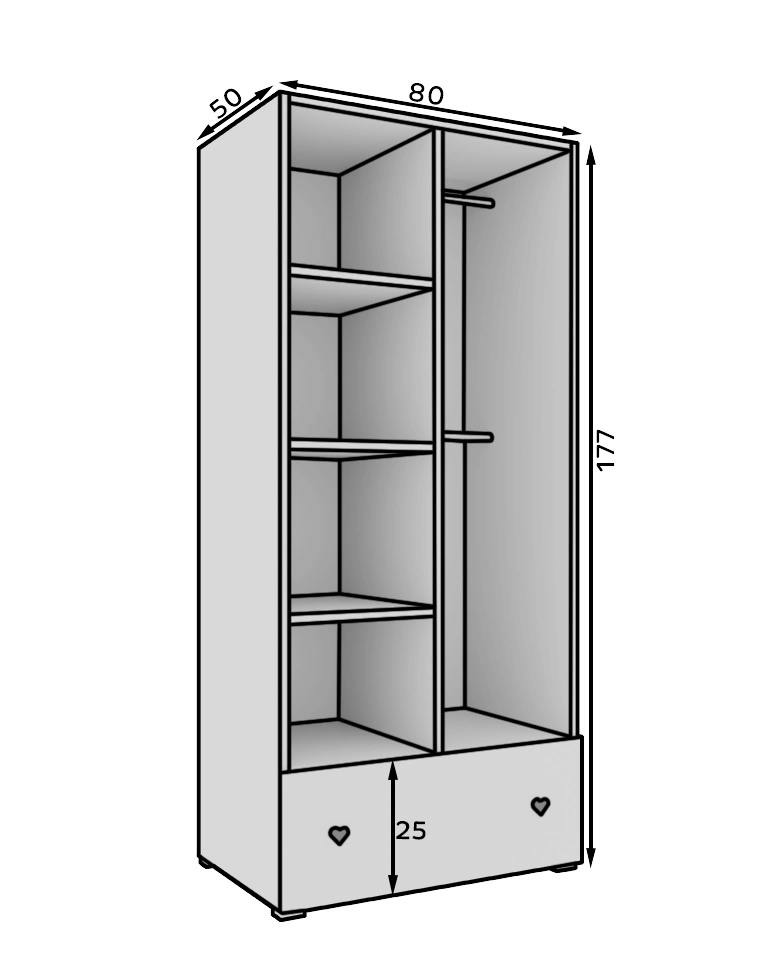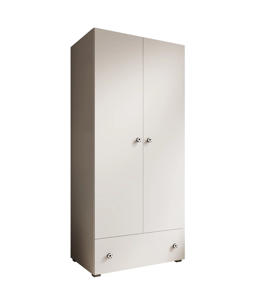 Szafa do pokoju jest skonstruowana z 2 drzwi oraz 1 szuflady. Szafa gwarantuje komfortowe i bezproblemowe korzystanie oraz trwałość całego mebla przez wiele lat użytkowania. Stylowy design sprawia, że szafa na ubrania z powodzeniem sprawdzi się jako szafa do pokoju dziecięcego, jako szafa do pokoju dziewczynki lub szafa dla niemowlaka.