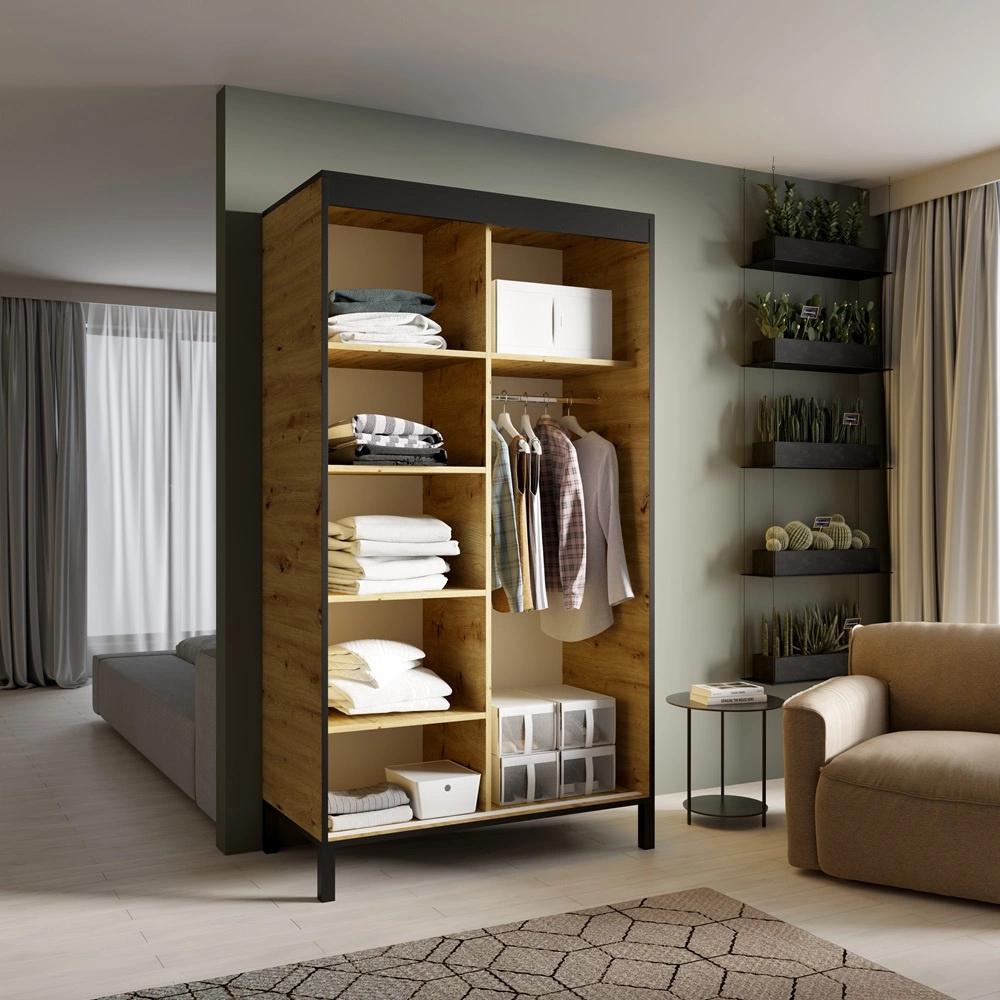 Szafa przesuwna z lustrem Bell 120 cm dąb artisan / czarny stylowa szafa do przedpokoju lub biura w stylu loftowym wysoka podstawa