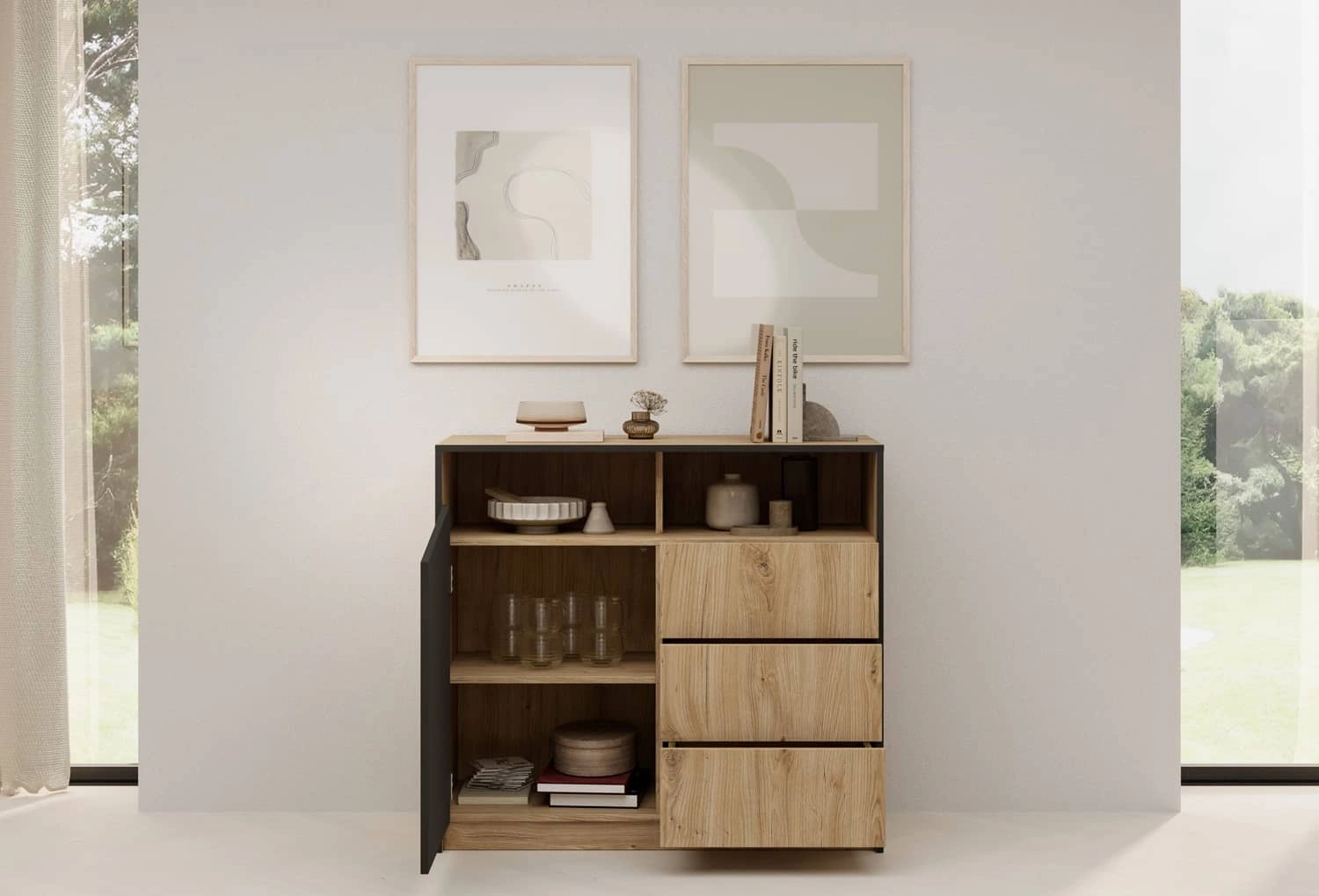 Komoda z szufladami Atson to doskonałe połączenie naturalnego uroku drewna z minimalizmem w postaci czarnych akcentów. Oryginalny kształt drzwi, a także brak klasycznych uchwytów sprawiają, że komoda idealnie komponuje się z wnętrzami o surowym, minimalistycznym charakterze. Komoda oferuje pojemne szuflady i szafki, które pozwalają na wygodne przechowywanie różnych przedmiotów i najpotrzebniejszych akcesoriów. Dzięki szerokiej, stabilnej konstrukcji komoda może pełnić funkcję zarówno klasycznego mebla do salonu, jak i praktycznego elementu wyposażenia sypialni, gabinetu czy jadalni.
