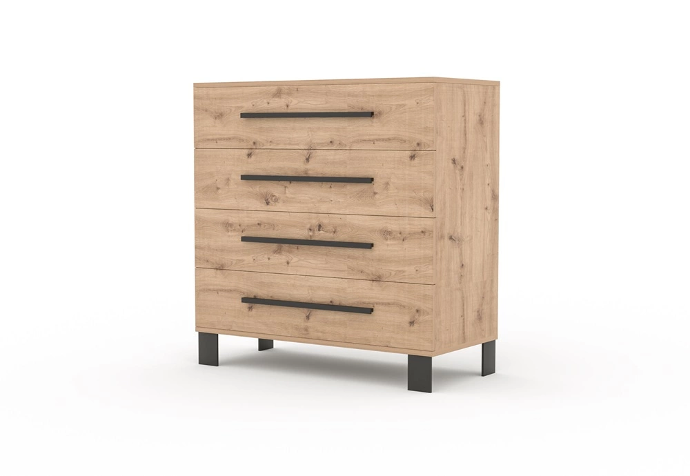 Komoda z szufladami Malen to atrakcyjny mebel do sypialni, pokoju dziennego lub salonu. Ciekawe zestawienie ciepłego dekoru dębu artisan z kontrastową czernią dodają wnętrzu ciepła i estetycznego wyglądu. Charakterystyczne elementy komody to proste, minimalistyczne uchwyty oraz wysokie nogi o nietuzinkowym designie. Obecność komody stanie się stylowym wykończeniem pomieszczenia oraz nada mu niepowtarzalnego klimatu. Komoda z powodzeniem odnajdzie się we wnętrzach w stylu skandynawskim, industrialnym, klasycznym jak i nowoczesnym.