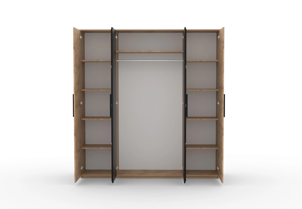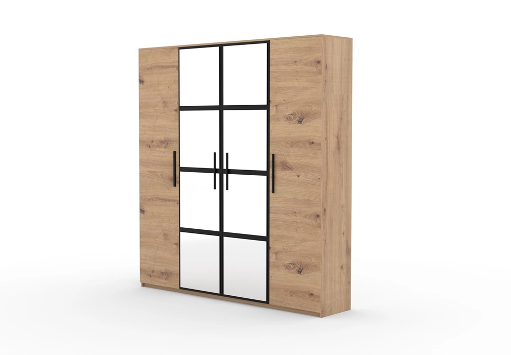 Szafa z lustrem jest skonstruowana z 4 drzwi. Dębowe wybarwienie z czarnym dekorem świetnie łączy się z innymi kolorami, dzięki czemu szafa na ubrania z powodzeniem sprawdzi się jako szafa z lustrem do sypialni, jako szafa do przedpokoju lub szafa do pokoju dziecięcego. Szafa z lustrem Malen będzie również świetnym wyborem do pokoju młodzieżowego. Doskonale sprawdzi się także w roli garderoby do przedpokoju.