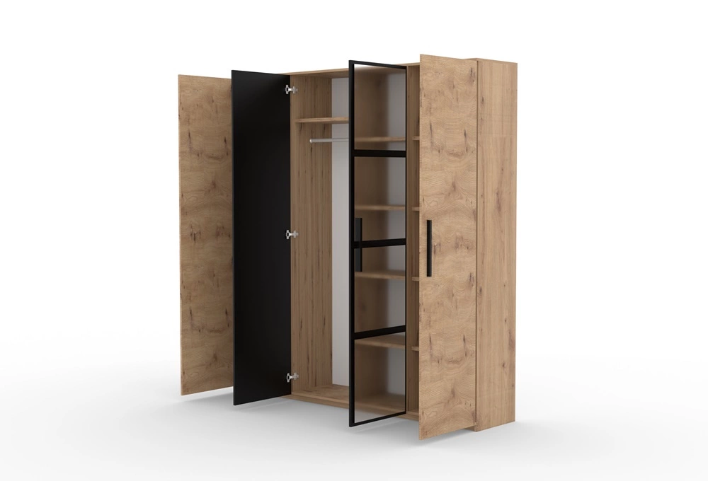 Szafa z lustrem Malen to atrakcyjny mebel do sypialni, przedpokoju lub garderoby. Ciekawe zestawienie ciepłego dekoru dębu artisan z kontrastową czernią dodają wnętrzu ciepła i estetycznego wyglądu. Charakterystyczne elementy szafy to proste, minimalistyczne uchwyty oraz duże tafle luster na środkowych drzwiach szafy. Obecność szafy stanie się stylowym wykończeniem pomieszczenia oraz nada mu niepowtarzalnego klimatu. Szafa ubraniowa z powodzeniem odnajdzie się we wnętrzach w stylu skandynawskim, industrialnym, klasycznym jak i nowoczesnym.