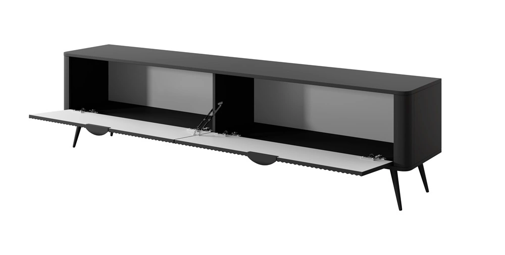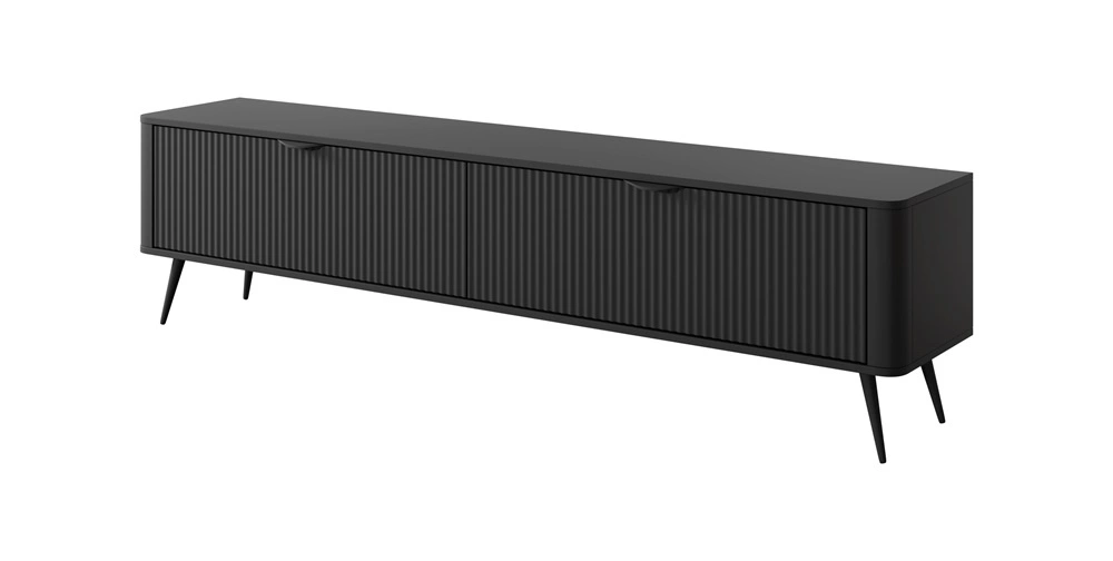 Szafka RTV Lante 200 cm czarna nowoczesny design bryła osadzona na wysokich nogach ryflowany front charakterystyczny owalny kształt