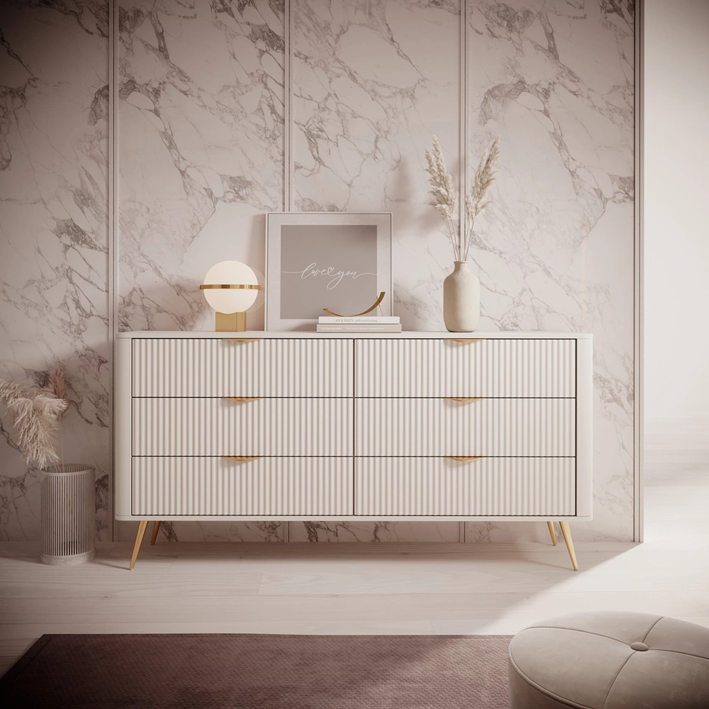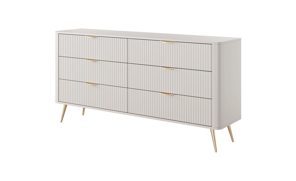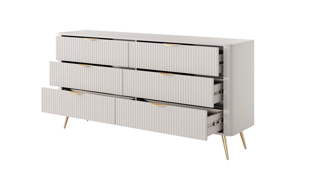 Ryflowane fronty szuflad zostały wykonane z płyty MDF. Korpus komody wykonany z wysokiej jakości płyty laminowanej o grubości 16mm, która charakteryzuje się odpornością na wpływ czynników zewnętrznych takich jak obicia, uderzenia i niefortunne zadrapania. Konstrukcję mebla urozmaicono złotymi metalowymi nogami. Precyzyjne wykończenie i dbałość o detale sprawiają, że komoda zachowa swój piękny wygląd na wiele lat, nie tracąc przy tym na funkcjonalności.