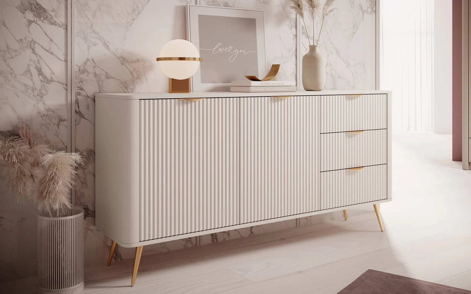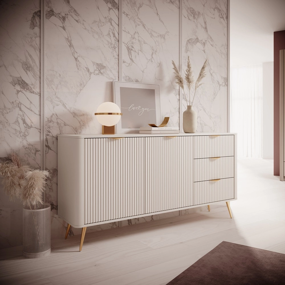 Ryflowane fronty zostały wykonane z płyty MDF. Korpus komody wykonany jest z wysokiej jakości płyty laminowanej o grubości 16mm, która charakteryzuje się odpornością na wpływ czynników zewnętrznych takich jak obicia, uderzenia i niefortunne zadrapania. Konstrukcję mebla urozmaicono złotymi metalowymi nogami. Precyzyjne wykończenie i dbałość o detale sprawiają, że komoda zachowa swój piękny wygląd na wiele lat, nie tracąc przy tym na funkcjonalności.