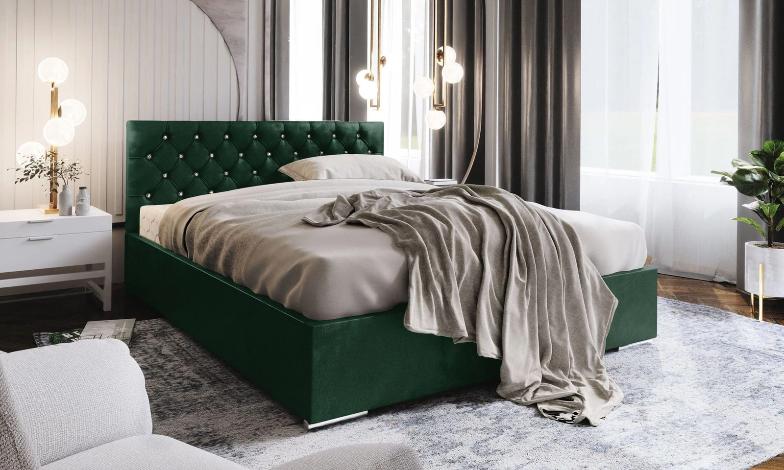 Łóżko tapicerowane Bauru 140x200 butelkowa zieleń z pojemnikiem w nowoczesnym skandynawskim stylu z pikowanym zagłówkiem z kryształkami