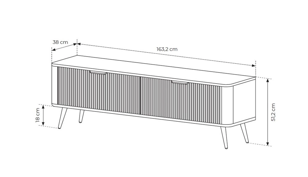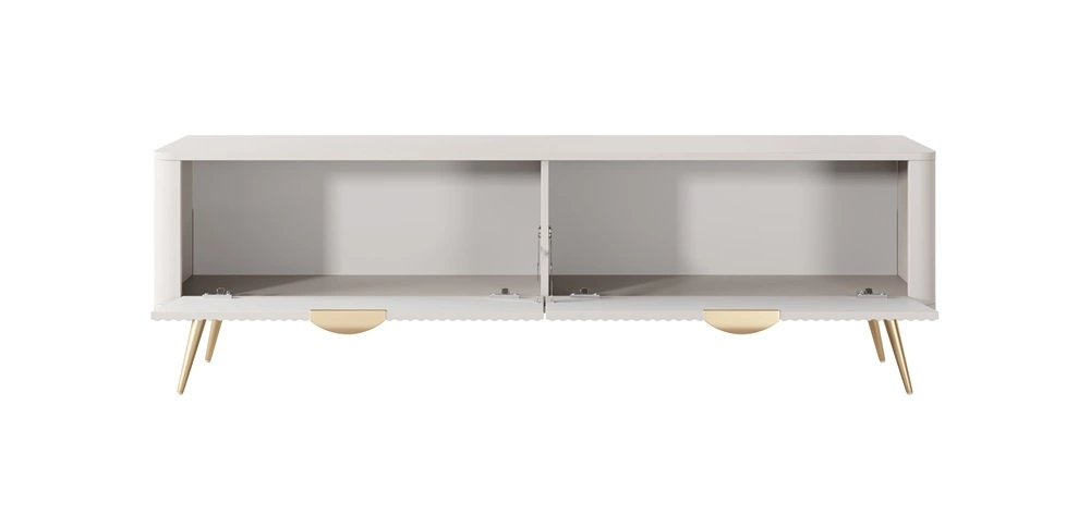 Ryflowane fronty zostały wykonane z płyty MDF. Korpus szafki RTV wykonany jest z wysokiej jakości płyty laminowanej o grubości 16mm, która charakteryzuje się odpornością na wpływ czynników zewnętrznych takich jak obicia, uderzenia i niefortunne zadrapania. Konstrukcję mebla urozmaicono złotymi metalowymi nogami. Precyzyjne wykończenie i dbałość o detale sprawiają, że szafka pod telewizor zachowa swój piękny wygląd na wiele lat, nie tracąc przy tym na funkcjonalności.
