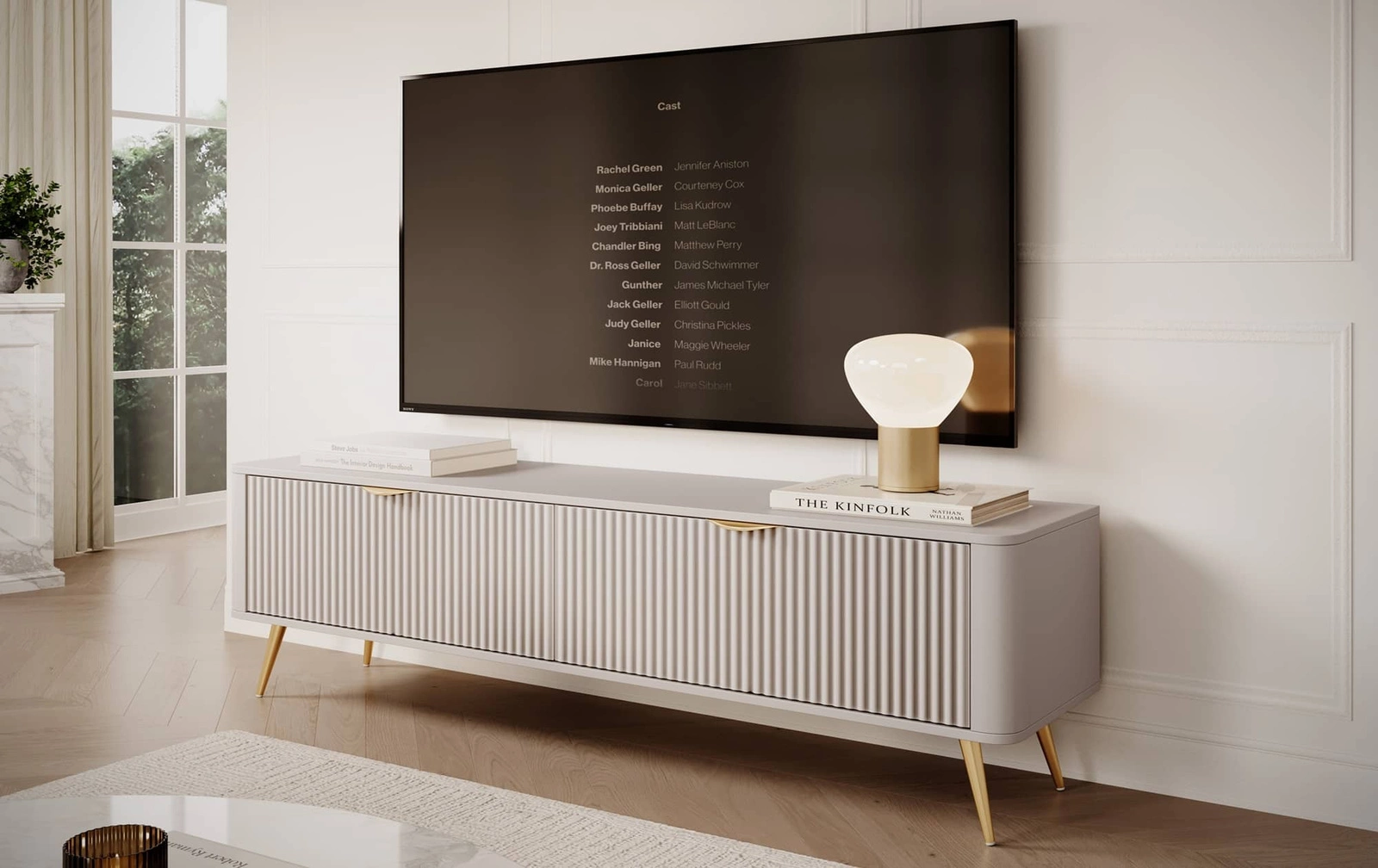 Szafka RTV Lante 163 cm beżowa designerska szafka pod telewizor w modnym stylu zaokrąglone krawędzie bryły gustowny ryflowany front