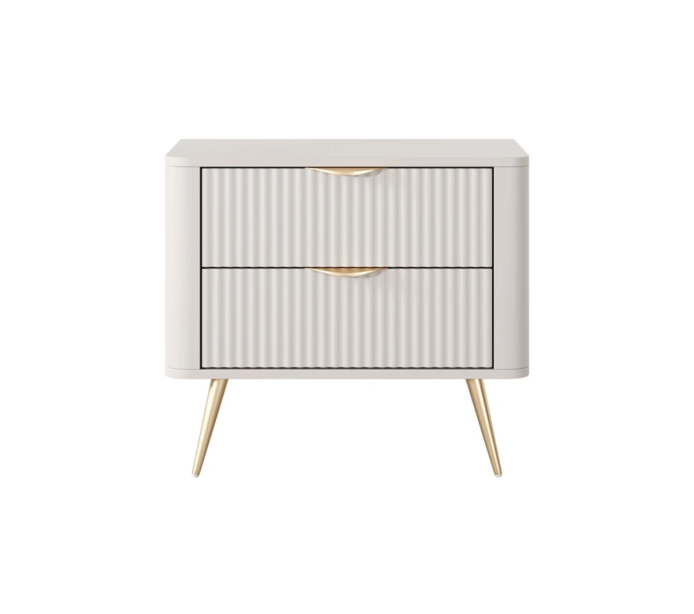 Ryflowane fronty zostały wykonane z płyty MDF. Korpus szafki nocnej wykonany jest z wysokiej jakości płyty laminowanej o grubości 16mm, która charakteryzuje się odpornością na wpływ czynników zewnętrznych takich jak obicia, uderzenia i niefortunne zadrapania. Konstrukcję mebla urozmaicono złotymi metalowymi nogami. Precyzyjne wykończenie i dbałość o detale sprawiają, że szafka nocna zachowa swój piękny wygląd na wiele lat, nie tracąc przy tym na funkcjonalności.
