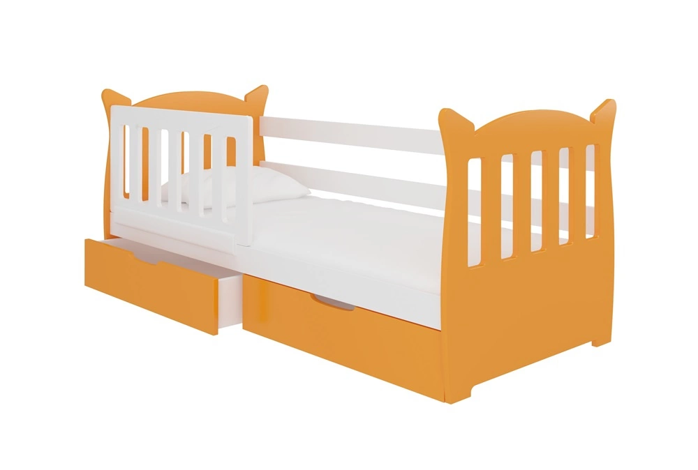 Łóżko Lena 75x160 cm pomarańczowy / biały komfortowe łóżko z materacem do pokoju dziecięcego wyposażone w barierkę ochronną i szuflady