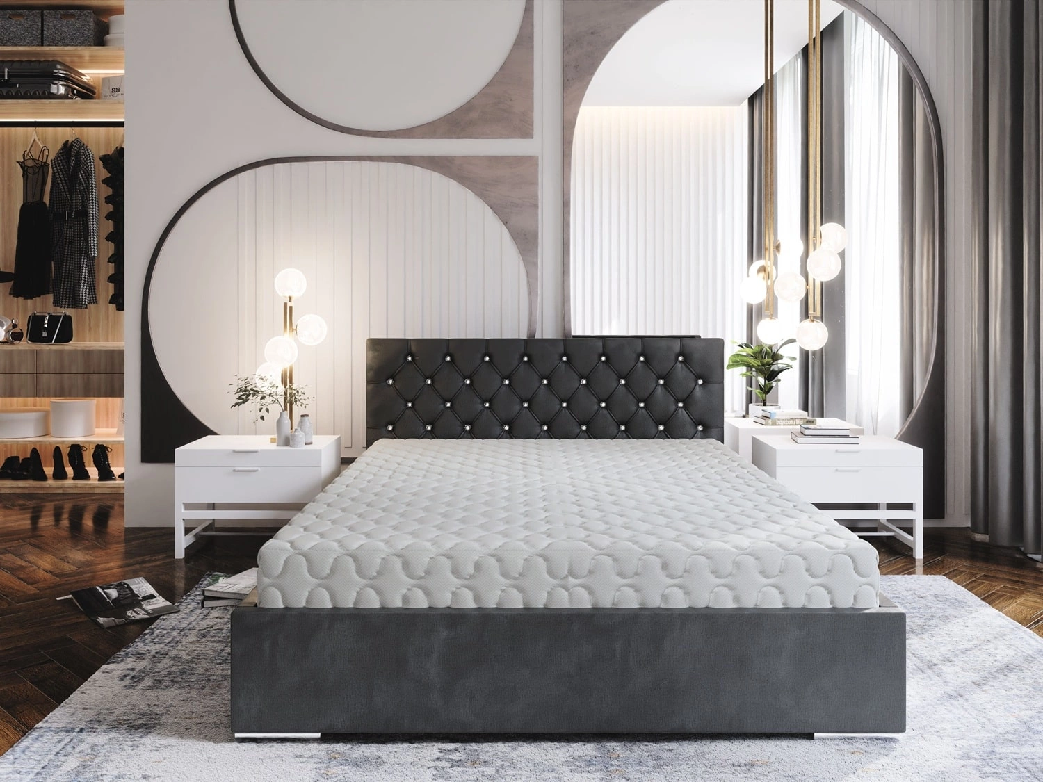 Łóżko wykonane z tkaniny typu velvet Monolith 92 gwarantuje najwyższy komfort i funkcjonalność podczas codziennego wypoczynku w sypialni. Tkanina posiada powłokę hydrofobową, co gwarantuje ograniczone wchłanianie cieczy. Ciekawa struktura tkaniny nadaje wyjątkowego charakteru. Dzięki wszystkim właściwościom użytej tkaniny, łóżko na długo zachowa swój pierwotny wygląd. Konstrukcja łóżka zapewnia dużą stabilność i wygodę użytkowania. Rama łóżka jest wykonana z drewna oraz płyty meblowej. Pikowane wezgłowie wykończone kryształkami przyciąga wzrok i nadaje łóżku szczególnego charakteru.