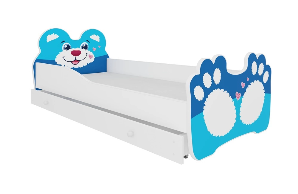 Łóżko Bear 70x140 cm biały / niebieski małe łóżko z materacem i szufladą na pościel w kształcie misia z uroczym nadrukiem niedźwiadka
