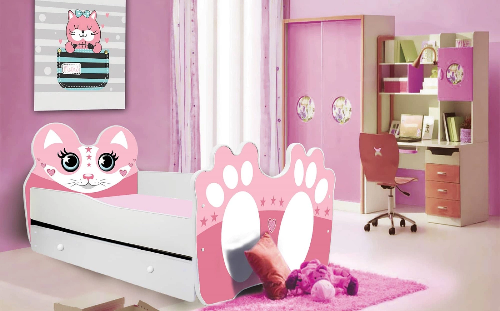 Łóżko Bear 80x160 cm biały / różowy małe łóżko z materacem i szufladą na pościel w kształcie misia z uroczym nadrukiem kotka