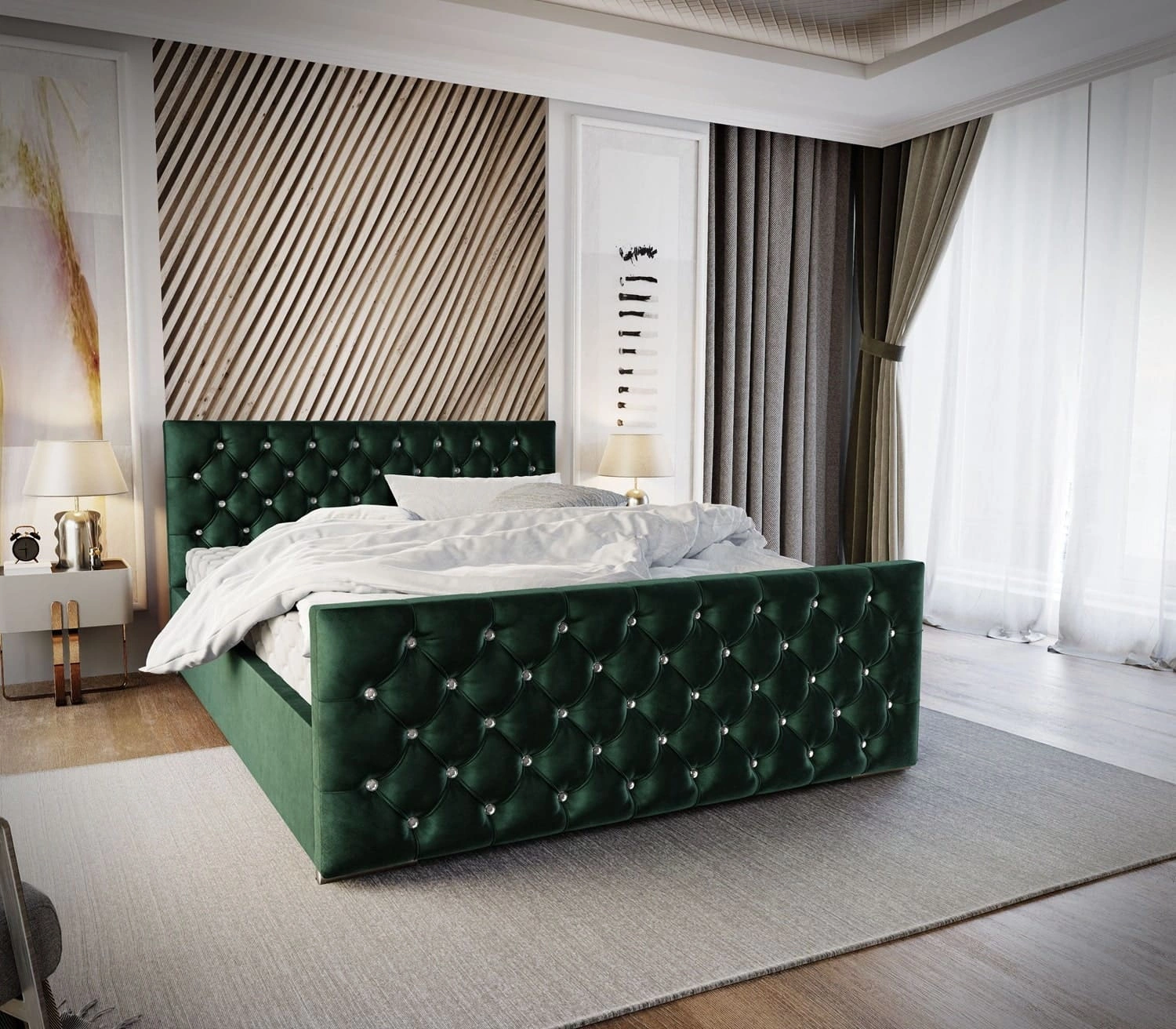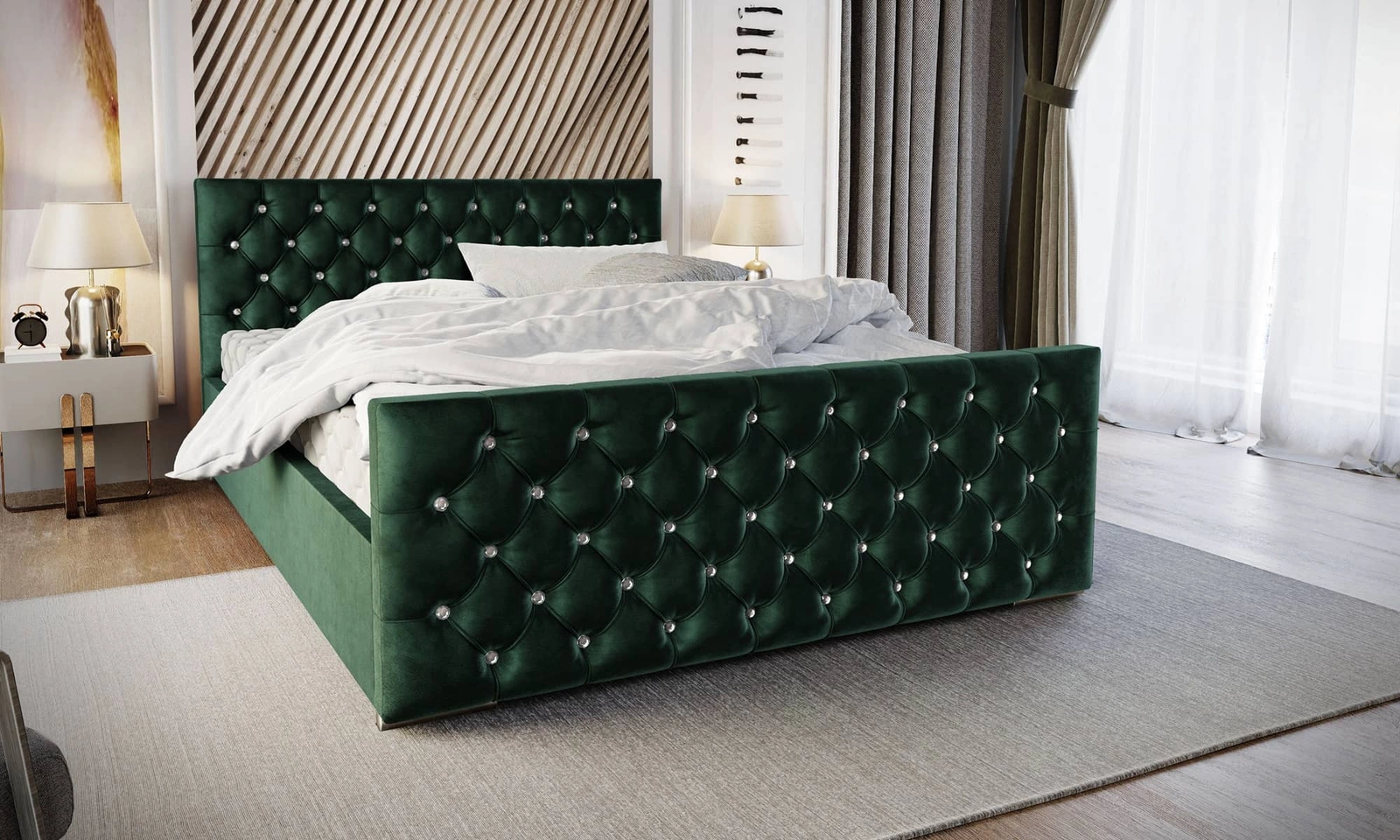 Łóżko tapicerowane Uberaba 160x200 butelkowa zieleń z pojemnikiem w nowoczesnym skandynawskim stylu z pikowanym wezgłowiem i zanóżkiem z kryształkami