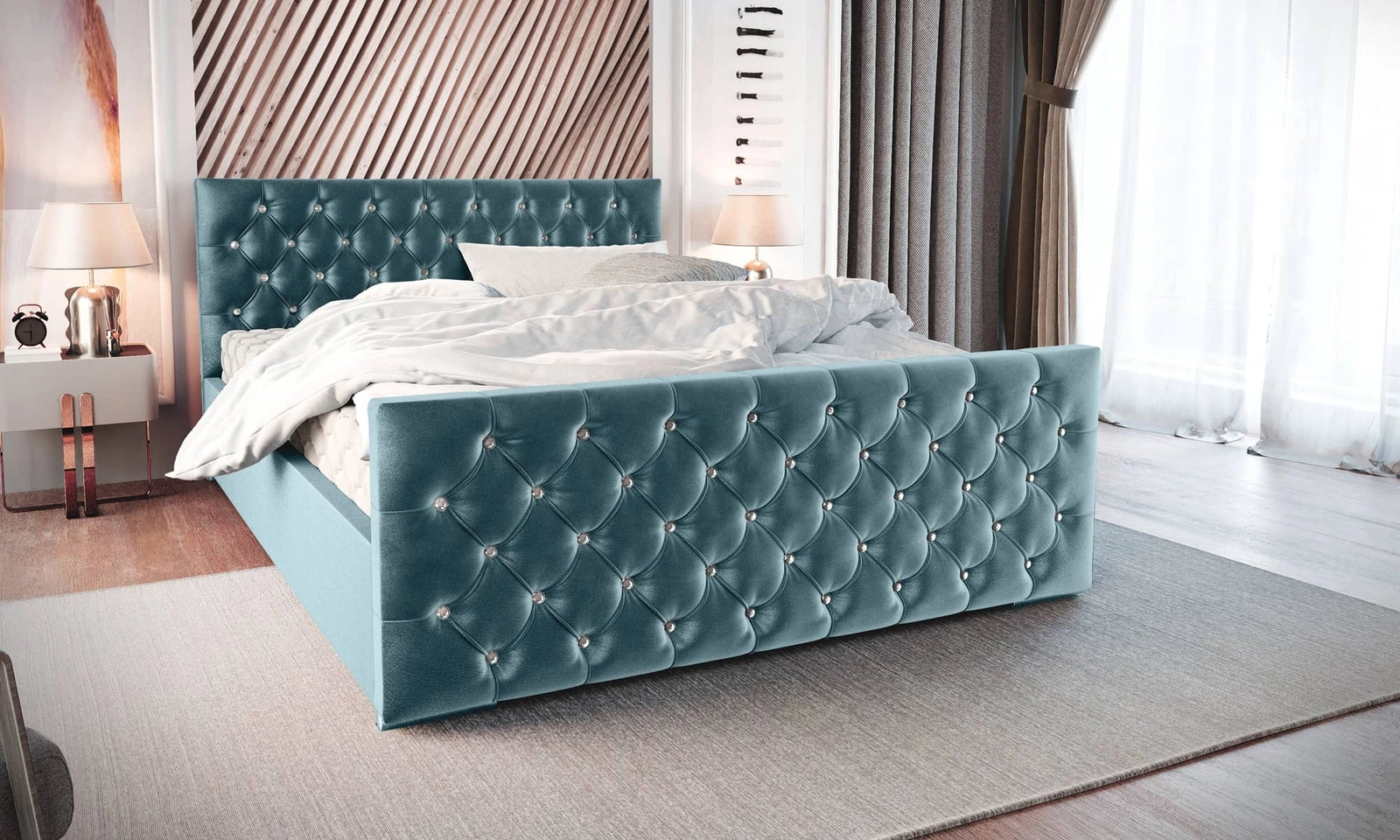 Łóżko tapicerowane Uberaba 160x200 turkusowe z pojemnikiem w nowoczesnym skandynawskim stylu z pikowanym wezgłowiem i zanóżkiem z kryształkami