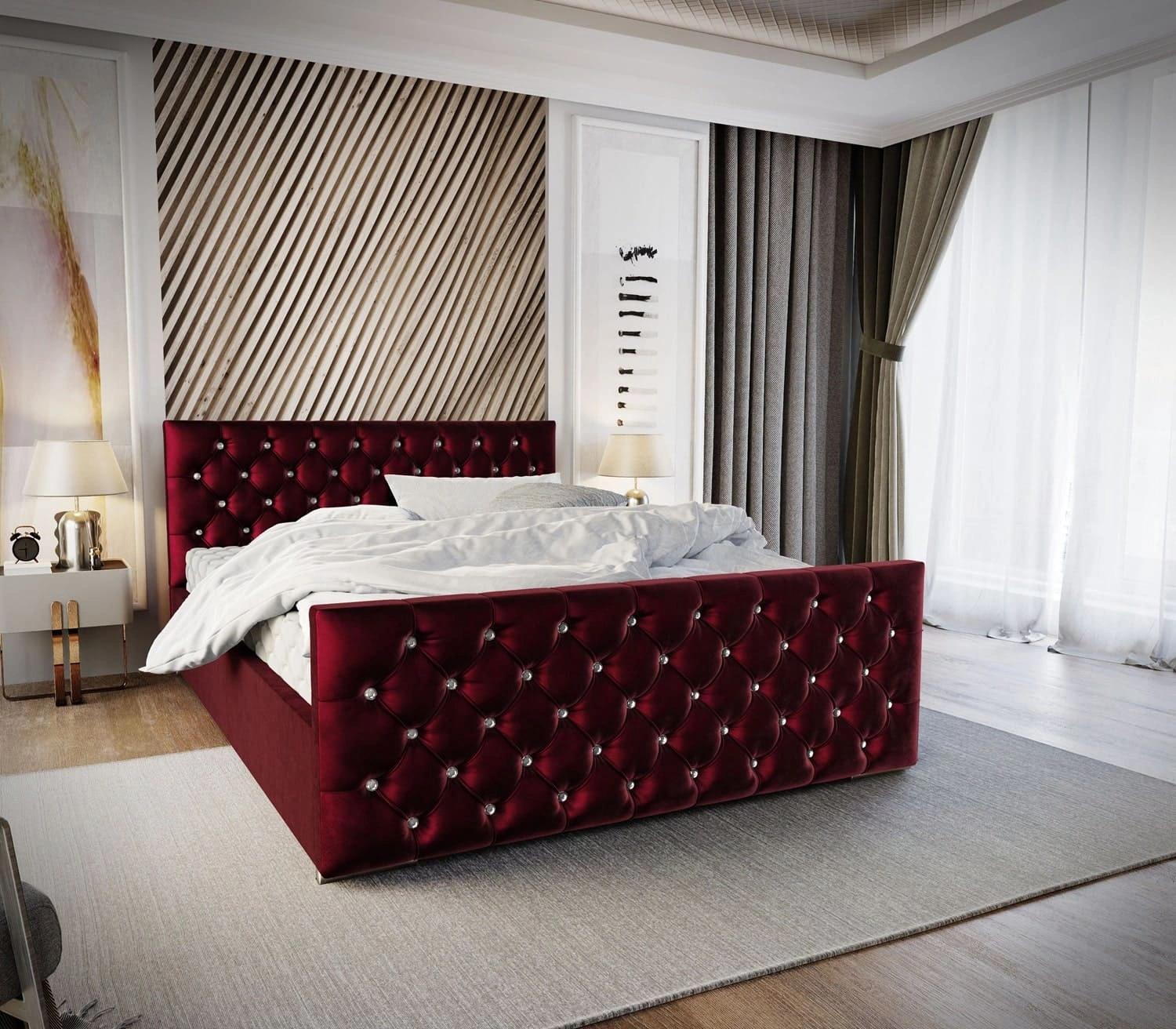 Łóżko tapicerowane Uberaba 180x200 bordowe z pojemnikiem w nowoczesnym skandynawskim stylu z pikowanym wezgłowiem i zanóżkiem z kryształkami