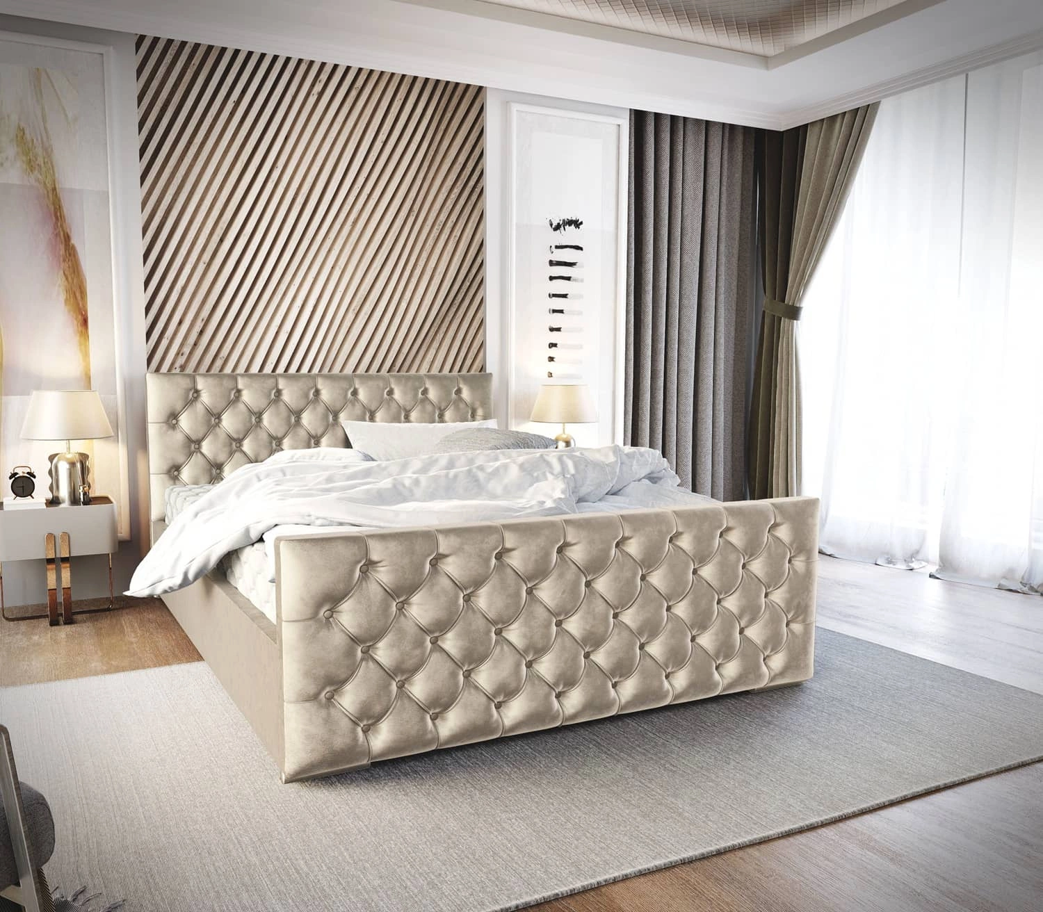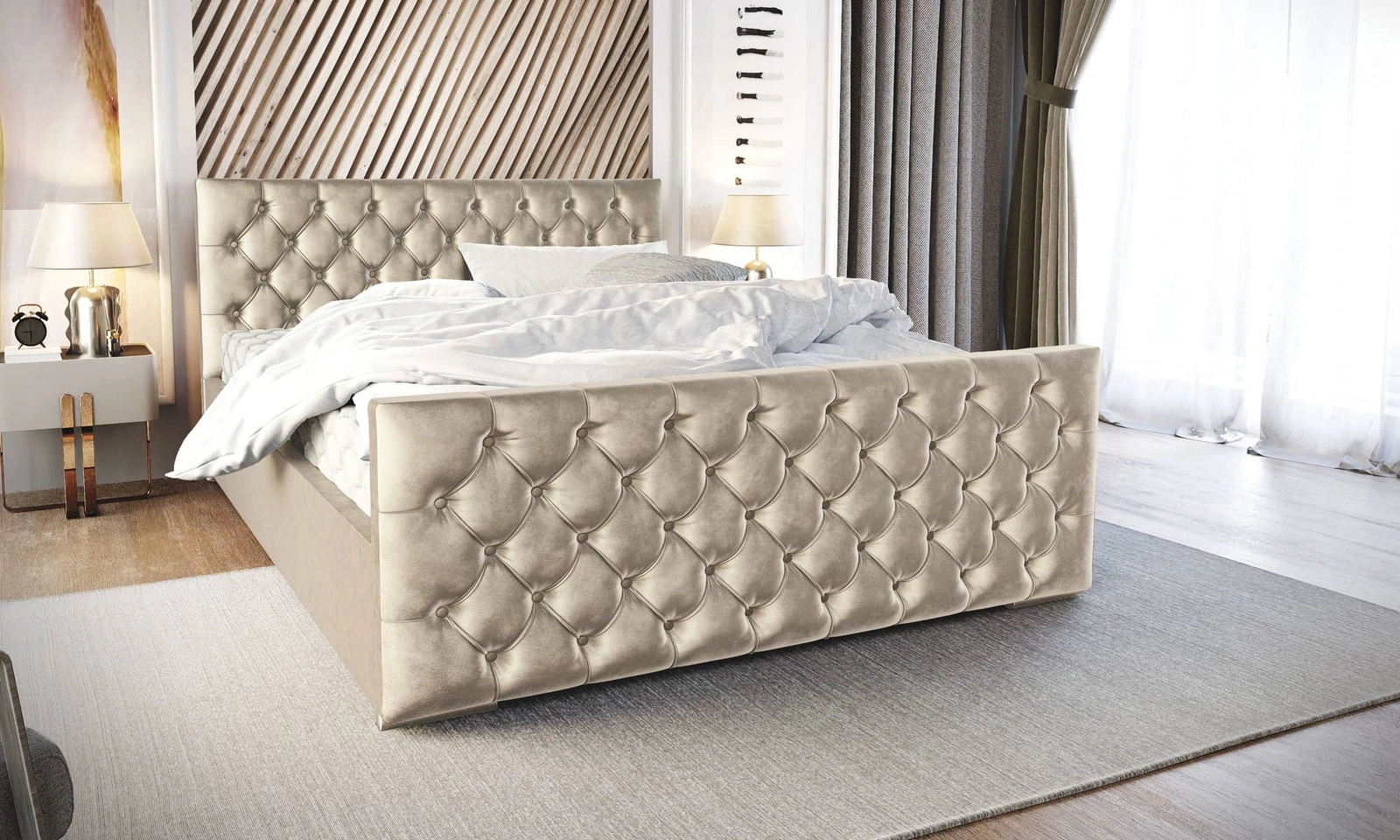 Łóżko tapicerowane Viamao 180x200 beżowe z pojemnikiem w nowoczesnym skandynawskim stylu z pikowanym wezgłowiem oraz zanóżkiem