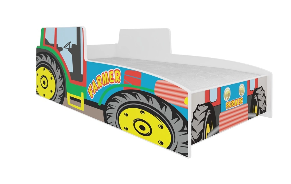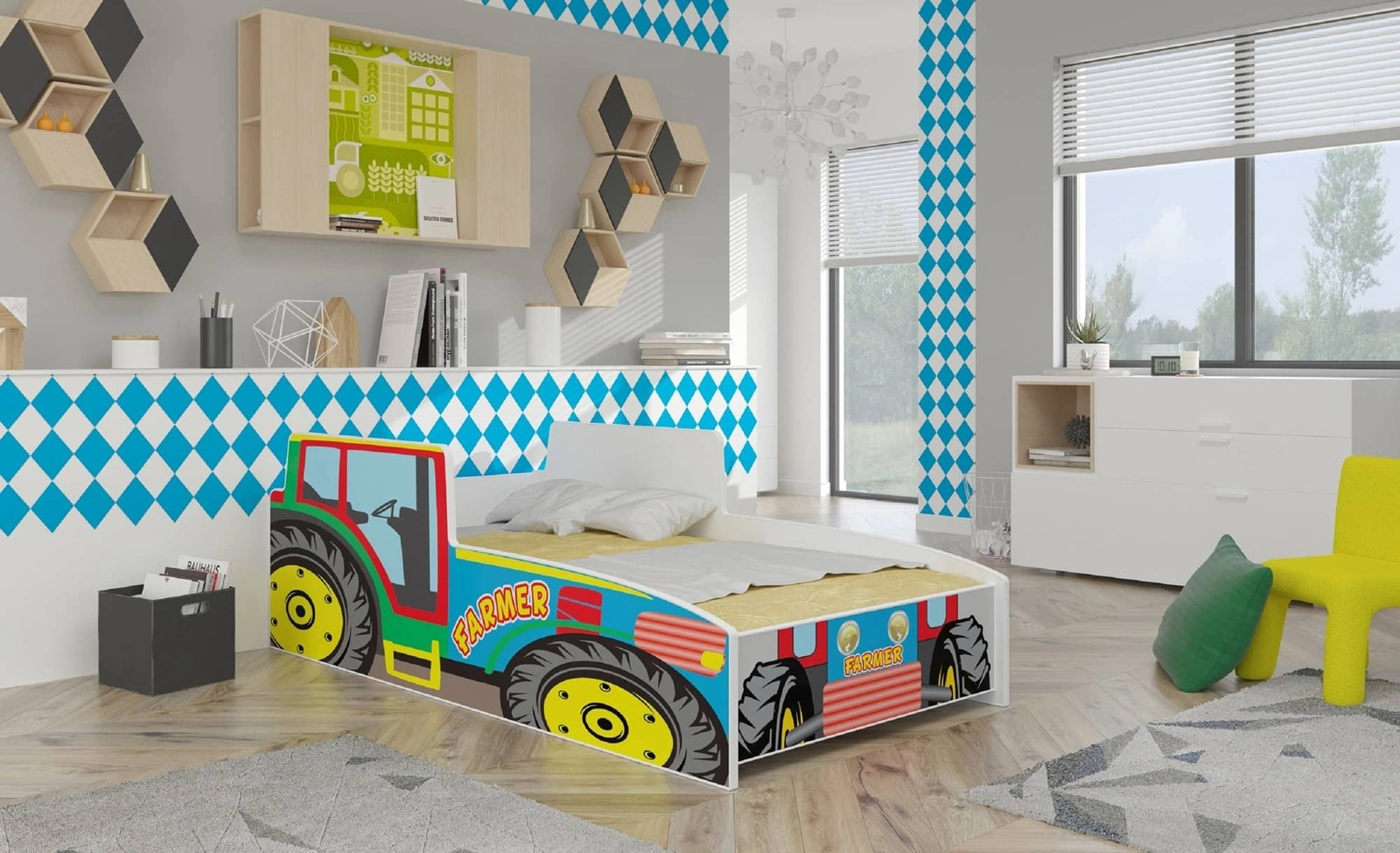 Łóżko Farmer 80x160 cm designerskie łóżko z materacem w kształcie traktora z ozdobnym nadrukiem wykonane z solidnych materiałów