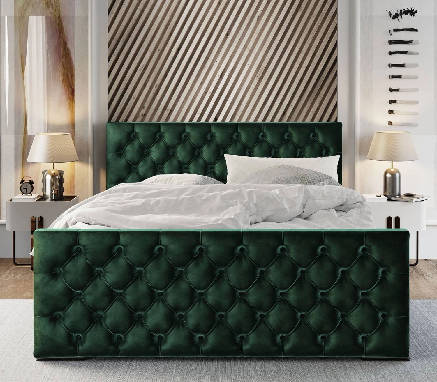 Łóżko tapicerowane Viamao 140x200 butelkowa zieleń z pojemnikiem w nowoczesnym skandynawskim stylu z pikowanym wezgłowiem oraz zanóżkiem