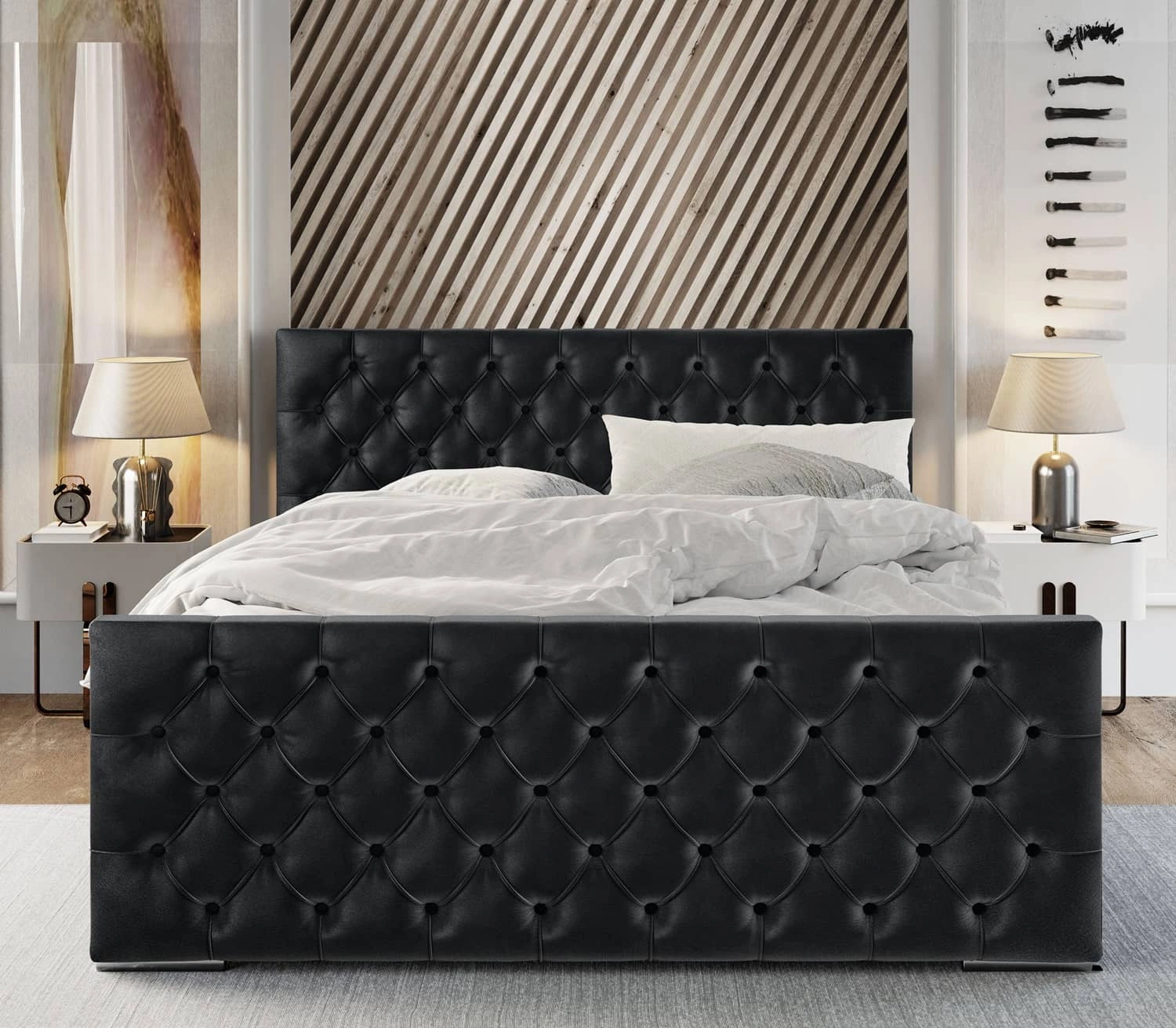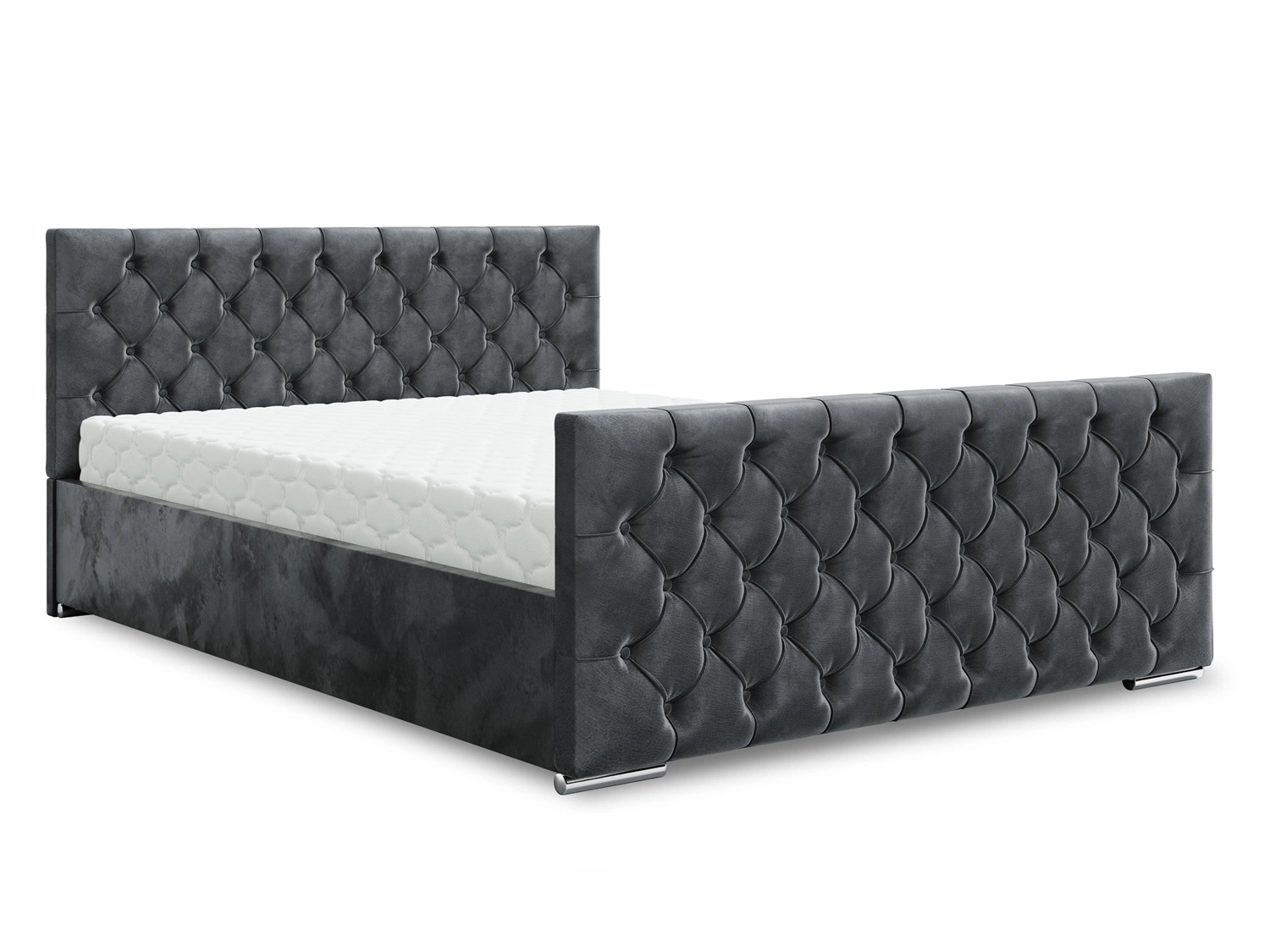 Łóżko tapicerowane Viamao 140x200 grafitowe z pojemnikiem w nowoczesnym skandynawskim stylu z pikowanym wezgłowiem oraz zanóżkiem