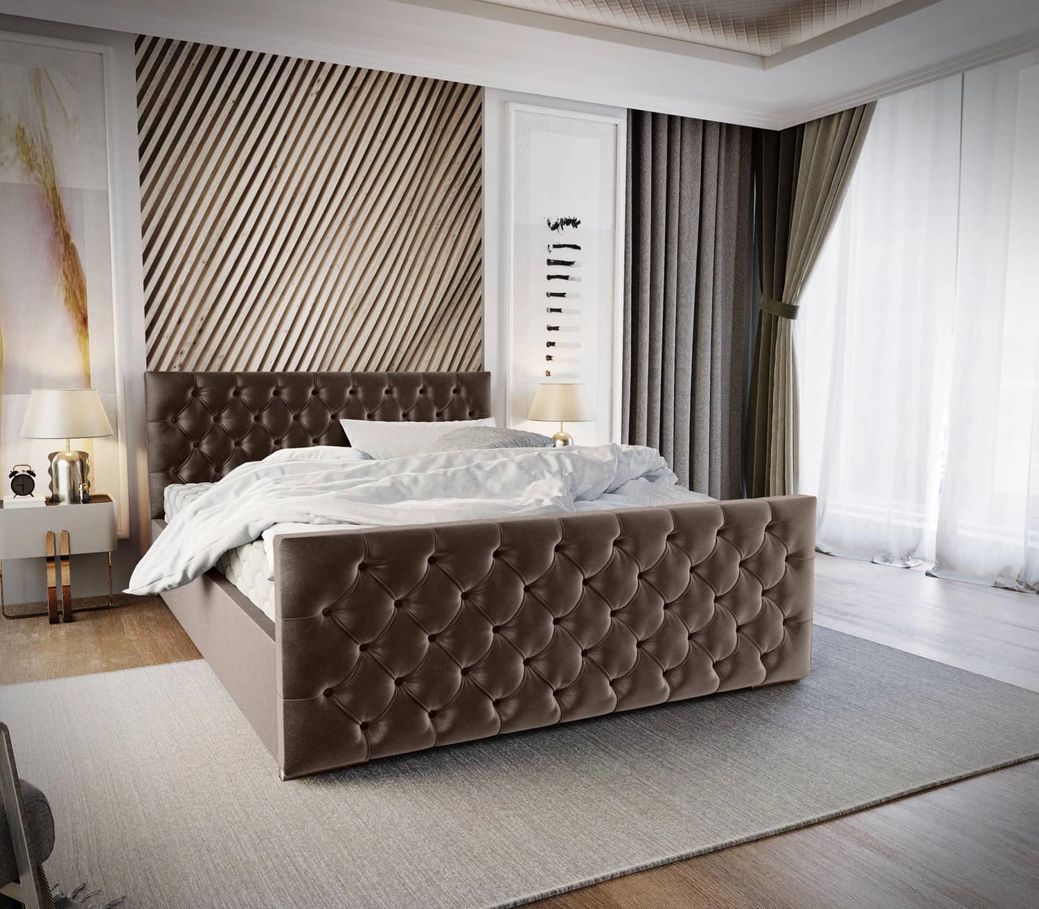 Łóżko tapicerowane Viamao 160x200 jasny brąz z pojemnikiem w nowoczesnym skandynawskim stylu z pikowanym wezgłowiem oraz zanóżkiem