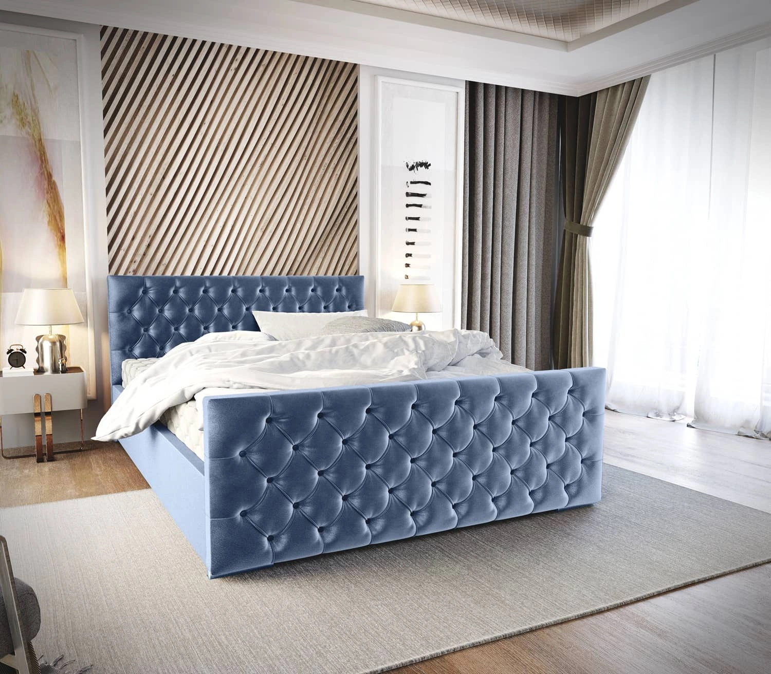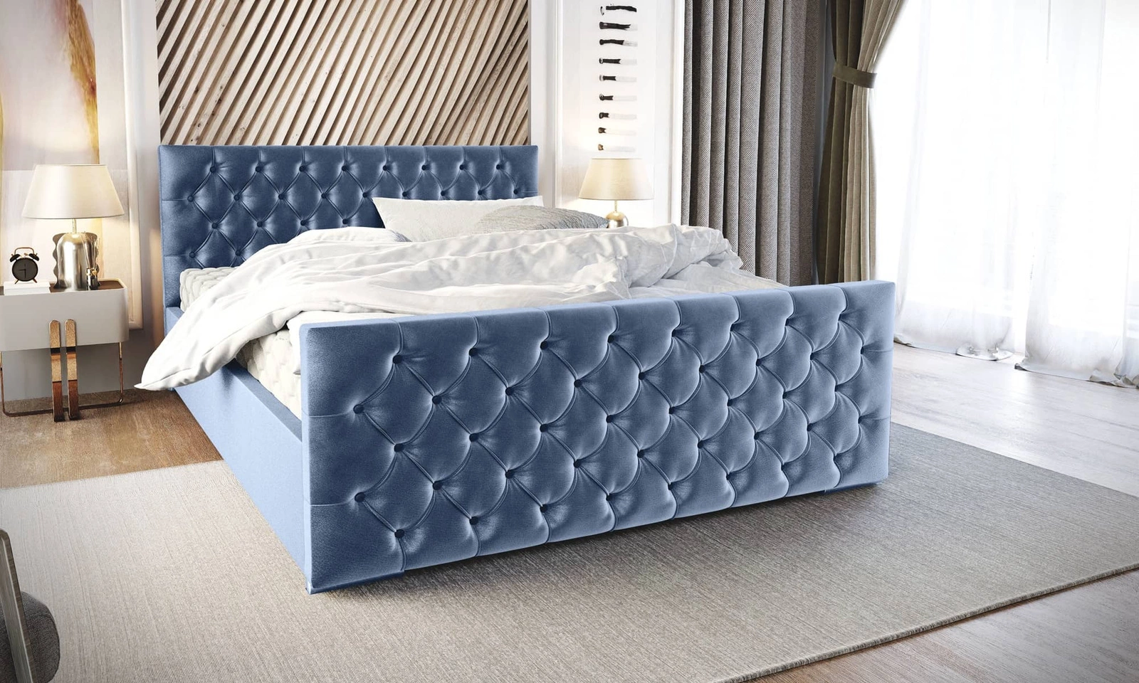 Łóżko tapicerowane Viamao 180x200 błękitne z pojemnikiem w nowoczesnym skandynawskim stylu z pikowanym wezgłowiem oraz zanóżkiem